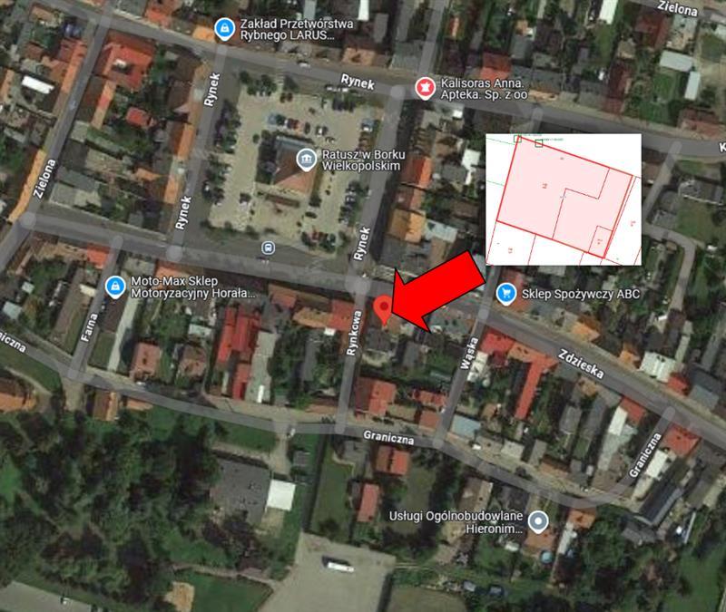 Przedmiotowa nieruchomość usytuowana jest w Borku Wielkopolskim, Rynek 20 działka nr 390/1. Działka numer 390/1 posiada dostęp do dróg publicznych od strony ul. Rynku, Rynkowej oraz Zdzieskiej. Wjazd na działkę odbywa się tylko od ulicy Zdzieskiej. Bezpośrednie sąsiedztwo przedmiotu szacowania to przede wszystkim nieruchomości gruntowe zabudowane budynkami mieszkalno–użytkowymi.