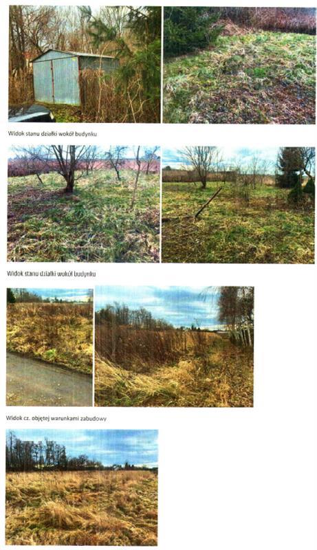 Działka jest zabudowana i cz. ogrodzona z bramą wjazdową i bramką pieszą od strony płn. Pozostała część porośnięta chwastami, w cz. zabudowanej drzewa owocowe, tuje, świerki.