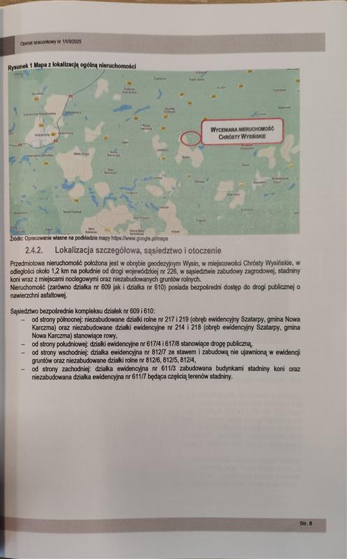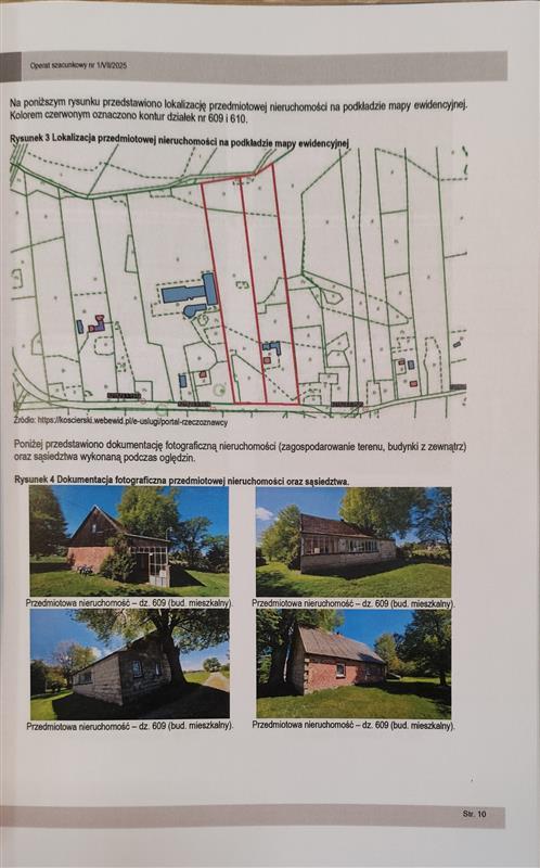 Nieruchomość stanowi zabudowaną działkę ewidencyjną nr 609 o powierzchni 2,70 ha. położona w obrębie geodezyjnym Wysin, gmina Liniewo, powiat kościerski. Działka nr 609 w części południowej zabudowana jest jednokondygnacyjnym, niepodpiwniczonym budynkiem mieszkalnym jednorodzinnym o powierzchni zabudowy 116 m2 oraz dwoma budynkami gospodarczymi o powierzchni zabudowy 237 m2 i 132 m2. W pozostałej części działka nr 609 wykorzystywana jest rolniczo. Na podstawie informacji planistycznych zawartych w serwisie internetowym https://liniewo.e-mapa.net/ ustalono, iż teren, na którym znajduje się działka nr 609 nie jest objęty miejscowym planem zagospodarowania przestrzennego. Zgodnie ze studium uwarunkowań i kierunków zagospodarowania przestrzennego gminy Liniewo, teren przedmiotowej nieruchomości oznaczony został jako tereny rolne.