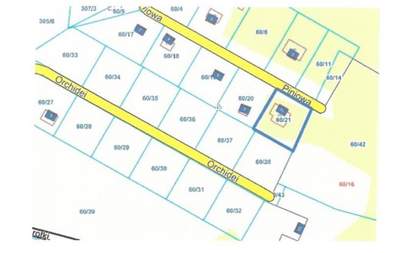 Działka posiada dostęp do drogi gminnej niepublicznej (ul. Kręta) o nawierzchni bitumicznej za pośrednictwem służebności przejścia i przejazdu przez działkę nr 60/8 (część ulicy Piniowej), która stanowi drogę wewnętrzną. Ulica Piniowa o nawierzchni gruntowej utwardzonej Działka uzbrojona w następującą infrastrukturę: wodę z wodociągu gminnego, energię elektryczną, przydomową oczyszczalnię ścieków. Działka ogrodzona, od strony drogi wewnętrznej obsługującej działkę ogrodzenie betonowe z wypełnieniami stalowymi + furtka + brama wjazdowa sterowana na pilota, z pozostałych stron ogrodzenie panelowe. Najbliższe sąsiedztwo przedmiotowej nieruchomości stanowią działki gruntu zabudowane zabudową mieszkaniową jednorodzinną lub działki przeznaczone pod taką zabudowę. Dalsze sąsiedztwo nieruchomości stanowią tereny leśne.