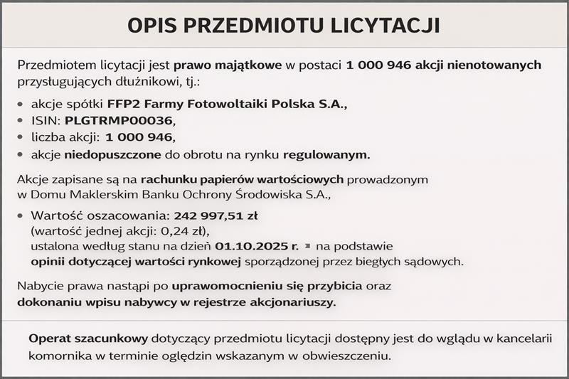 | 1 | 1 000 946 akcji Farmy Fotowoltaiki Polska S.A., ISIN PLGTRMP00036, niedopuszczone | 242 997,51 zł | 182 248,13 zł | 1 823,00 zł | 03.02.2026 10.00 | 10.02.2026 10.00 | Sosnowiec, ul. Stalowa, 3/4, 41-200, Sosnowiec. W dniu 27.01.2026 w godzinach od 10:00 do 14:00 |