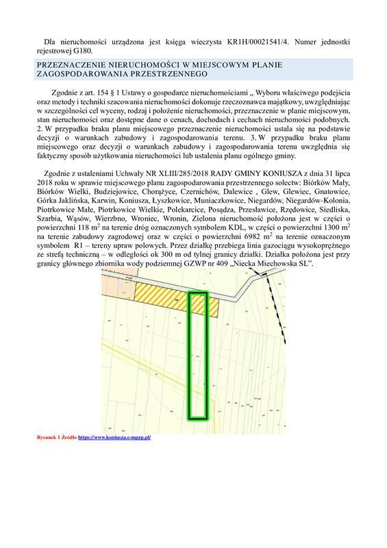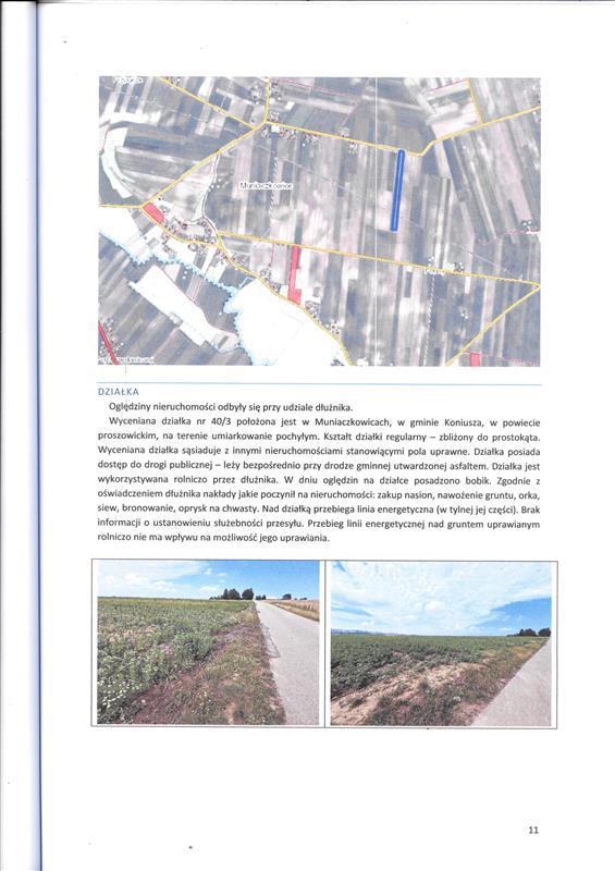 nieruchomość gruntowa niezabudowana, działka rolna nr 40/3, o pow. 0,8400 HA (8400m2) położona w gm. Koniusza, m. Muniaczkowice stanowiąca własność dłużnika Kowal Pawła, posiadająca założoną księgę wieczystą nr: KR1H/00021541/4. Zgodnie z ustaleniami Uchwały NR XLIII/285/2018 Rady Gminy Koniusza z dn. 31/07/2018 r. nieruchomość położona jest w części o pow. 118m2 na terenie dróg oznaczonych symbolem KDL, w części o pow. 1300 m2 na terenie zabudowy zagrodowej oraz w części o pow. 6982 m2 na terenie oznaczonym symbolem R1-tereny upraw polowych. Przez działkę przebiega linia gazociągu wysokoprężnego -w odległości ok. 300 m od tylnej granicy działki. Działka posiada bezpośredni dostęp do drogi publicznej.