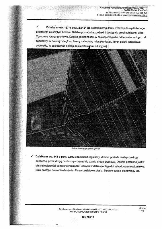 Przedmiotem licytacji jest udział wynoszący 1/2 części nieruchomości położonej pod adresem: SZYDŁOWO, 64-930 Szydłowo. Działka o nr. ew. 137 o pow. 2,9124 ha, kształt nieregularny, zbliżony do wydłużonego prostokąta ze ściętym bokiem. Działka posiada bezpośredni dostęp do drogi publicznej- ulica Ogrodowa, droga gruntowa. Działka położona jest w bliskiej odległości od terenów wolnych od zabudowy, w dalszej odległości tereny zabudowy mieszkaniowej. Teren płaski, częściowo podmokły. W sąsiedztwie dostęp do sieci telekomunikacyjnej.