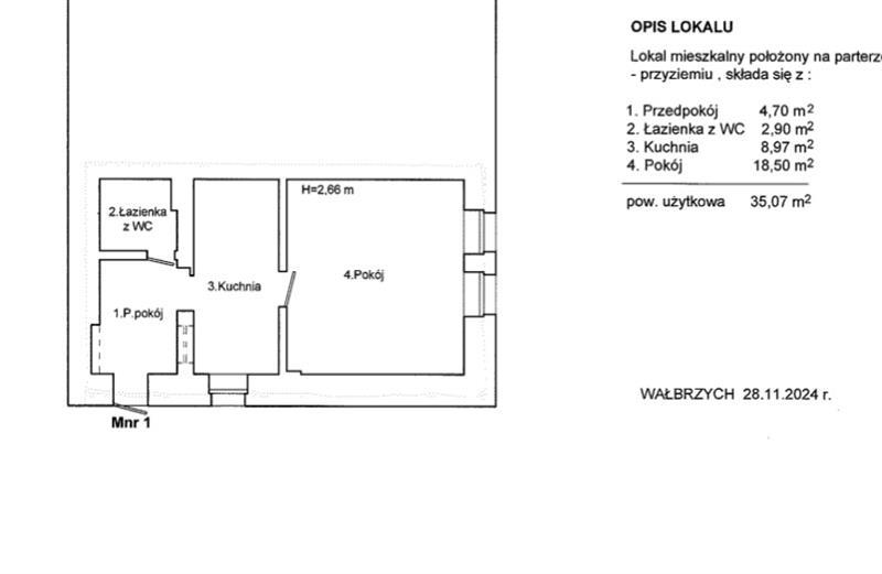 Lokal mieszkalny nr 1 usytuowany jest na pierwszej kondygnacji w budynku mieszkalnym wielorodzinnym. Lokal składa się z czterech pomieszczeń: pokój, kuchnia, łazienka z WC oraz przedpokój o łącznej powierzchni użytkowej 35,07 m2. Wysokość lokalu 266 cm. Lokal nie posiada pomieszczeń przynależnych. Standard wykończenia i wyposażenia lokalu oraz jego stan techniczny: niski. Lokal wyposażony jest w instalację: elektryczną aluminiową- zużyta i nieczynna; wodociągową; kanalizacyjną: sanitarną; ogrzewanie: piec CO na paliwo stałe- nieczynny; instalacja grzewcza tradycyjna i nieczynna; brak wentylacji grawitacyjnej.