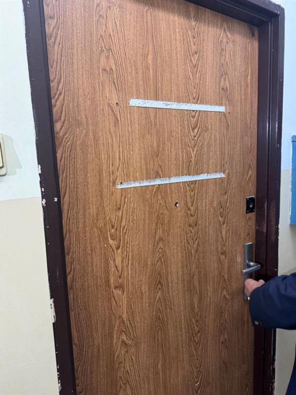 Wejście do lokalu z klatki schodowej do przedpokoju, z którego dostępna jest łazienka z wc, kuchnia oraz pokój.