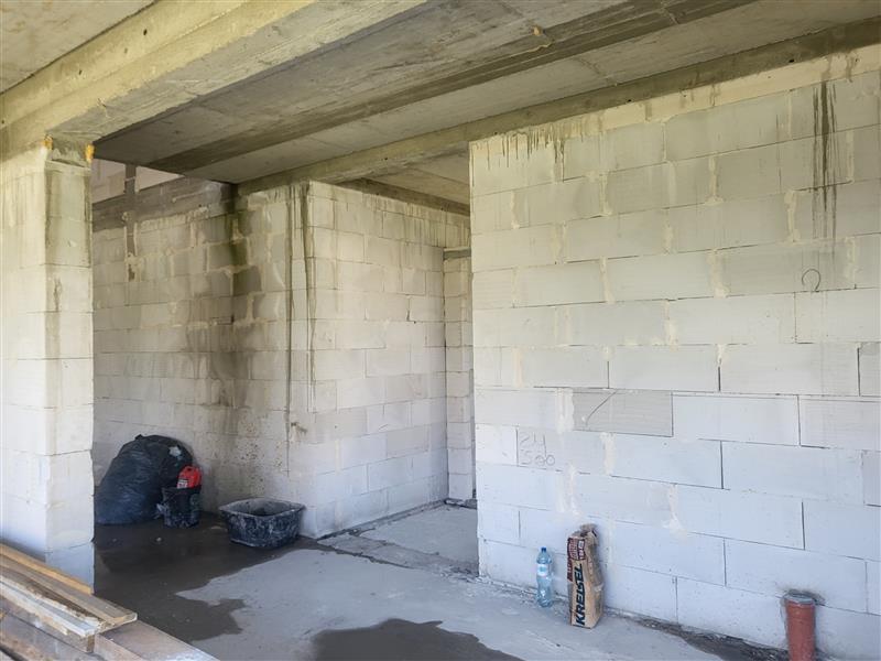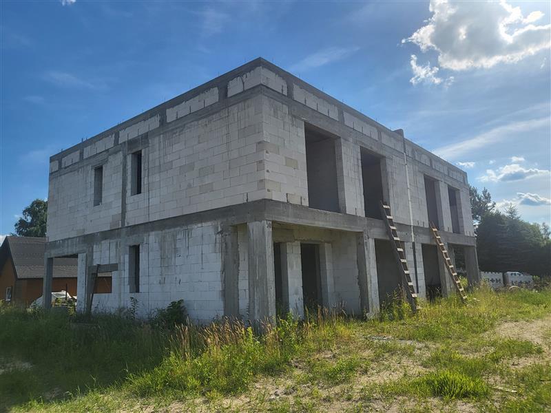 z garażami w bryle budynku, o powierzchni zabudowy 205,00 m2 i powierzchni użytkowej po 166,00 m2 każdy. Obecnie wykonane zostały fundamenty, ściany z bloczków betonu komórkowego i prefabrykowane stropy.