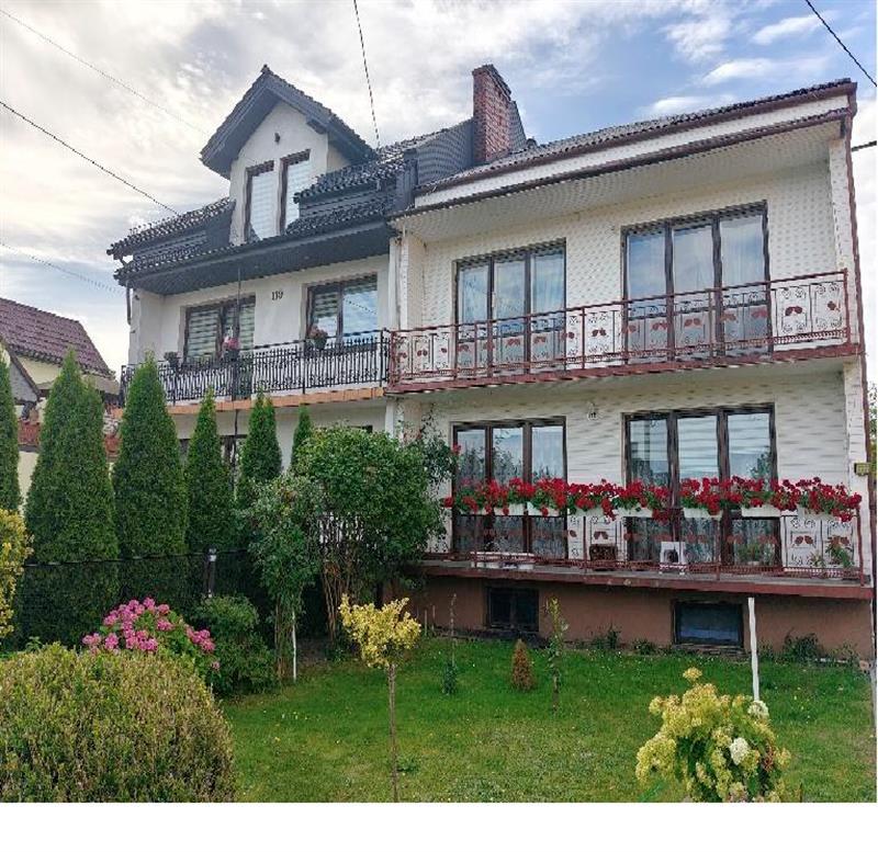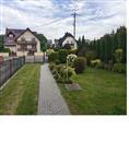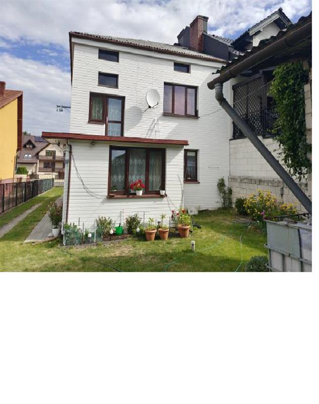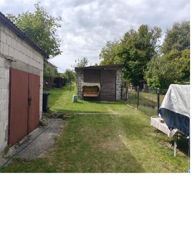 Działka prostokątna o wymiarach około 10 x 360 m.b. z dostępem do drogi publicznej. Uzbrojenie w media to instalacja wodna, gazowa, elektryczna. Grunt równy w części zabudowanej porośnięty trawą i zielenią ogrodową, ogrodzony siatką panelową na podmurówce, utwardzone dojście do domu kostką brukową Na powierzchni około 30 arów działka wykorzystywana jest do celów rolniczych. Działka nr 494/3 zabudowana jest dwupiętrowym, podpiwniczonym domem mieszkalnym powstałym w latach 70-tych XX wieku w zabudowie bliźniaczej. Budynek wykonany w technologii tradycyjnej murowanej, ocieplony, obłożony sidingiem, kryty dachem trójspadowym z eternitem. Stropodach niezagospodarowany. Dom składa się z komunikacji, która prowadzi schodami żelbetonowymi na parter i piętro, gdzie są dwa osobne mieszkania o identycznym rozkładzie pomieszczeń. Budynek ogrzewany piecem na węgiel, słabo ocieplony, Okna typu pcv. Wykończenia pomieszczeń w niskim standardzie. Podłogi wyłożone panelem lub płytkami ceramicznymi. Ściany wykończone panelem, malowane lub tapetowane. Łazienka z białym montażem i wyłożona płytkami ceramicznymi. Na działce dwa murowane budynki gospodarcze w niskim stanie technicznym. Przybliżona powierzchnia całkowita użytkowa domu wynosi 133 m2.