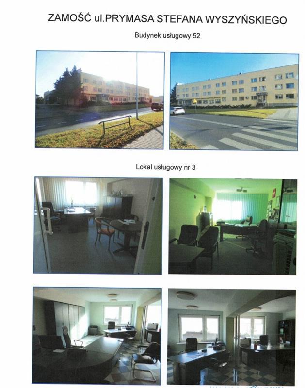 lokal użytkowy stanowiący odrębną nieruchomość położony pod adresem: 22-400 Zamość, Wyszyńskiego 52, dla którego Sąd Rejonowy w Zamościu VI Wydział Ksiąg Wieczystych prowadzi księgę wieczystą o numerze ZA1Z/00073209/3 o powierzchni użytkowej 152,70 m2, Licytowany lokal niemieszkalny nr 3 usytuowany jest na I piętrze, w zachodnim skrzydle budynku, wejście do niego z korytarza, poprzez część hotelową. Składa się z czterech pokoi biurowych (w tym jednego dyrektorskiego), sekretariatu, przedpokoju, dwóch korytarzy i wc dla personelu.