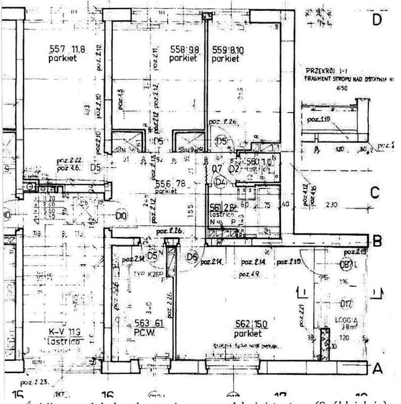 Lokal mieszkalny położony jest na pierwszej kondygnacji (parterze) budynku. Jego powierzchnia użytkowa wynosi 63,10 m2. Według księgi wieczystej i rzutu udostępnionego przez Spółdzielnię składa się z czterech pokoi, kuchni, łazienki z wc i przedpokoju. Przylega do niego loggia. Jest to mieszkanie narożne, rozkładowe. Po wejściu do mieszkania znajdujemy się w przedpokoju, z którego dostępne są na lewo trzy sypialnie, na prawo - kuchnia widna i duży pokój z loggią, a na wprost łazienka z wc. Do mieszkania przylega ogródek, nie jest on jednak prawem związanym z mieszkaniem.