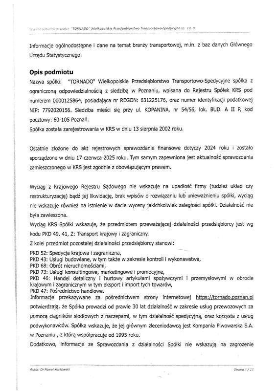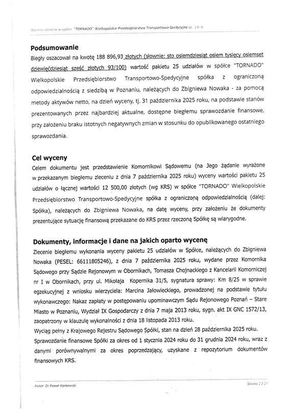 | 1 | udziały w spółce TORNADO Wielkopolskie Przedsiębiorstwo Transportowo Spedycyjne | 188 896,93 zł | 94 448,47 zł | 945,00 zł | Oborniki, ul. Mikołaja Kopernika 31/5, 31/5, 64-600, Oborniki. Od dnia 21.01.2026 do dnia 20.02.2026 w godzinach od 08:00 do 15:00 |