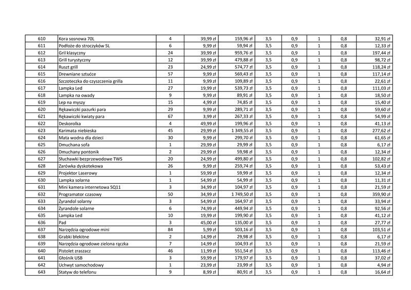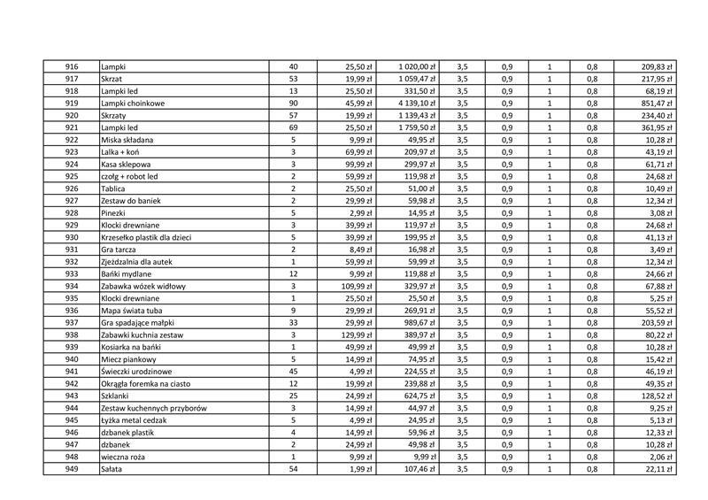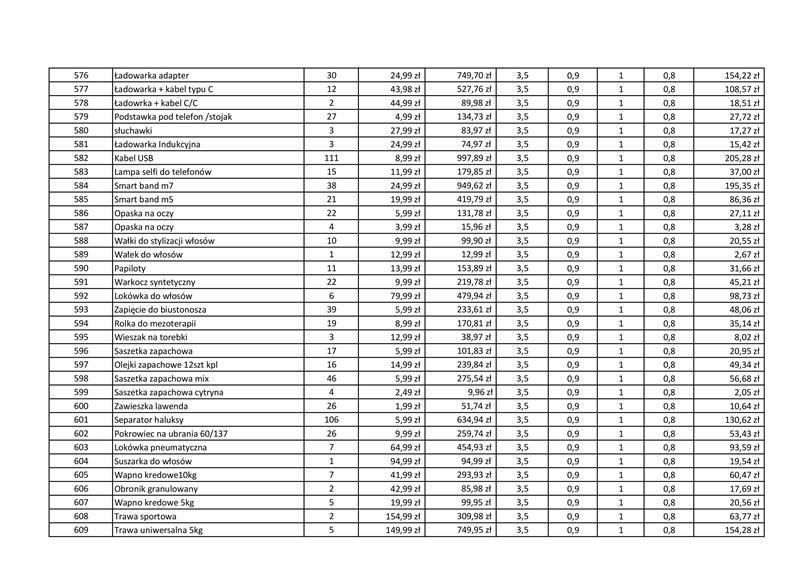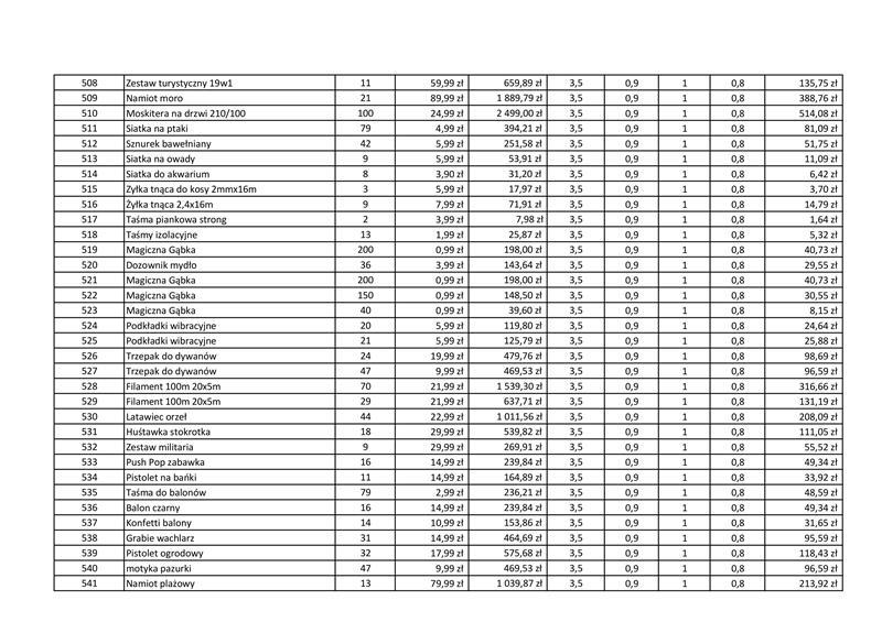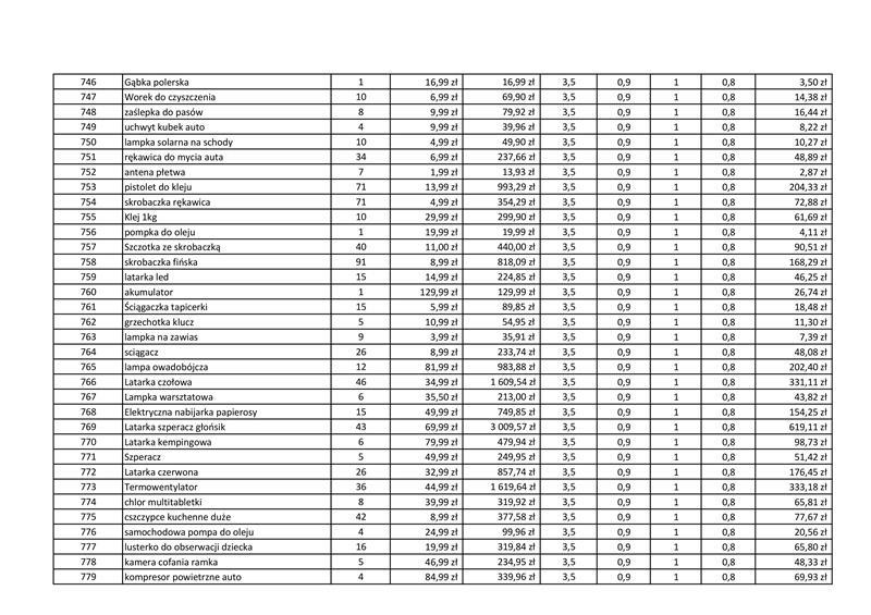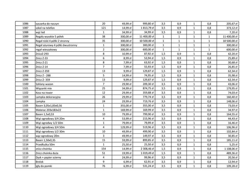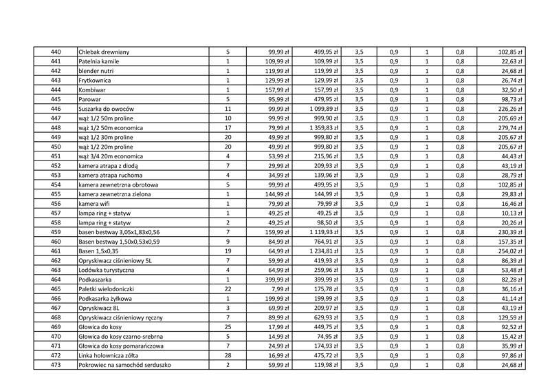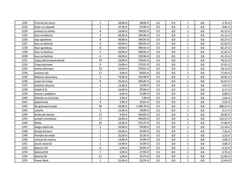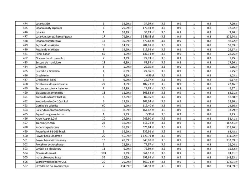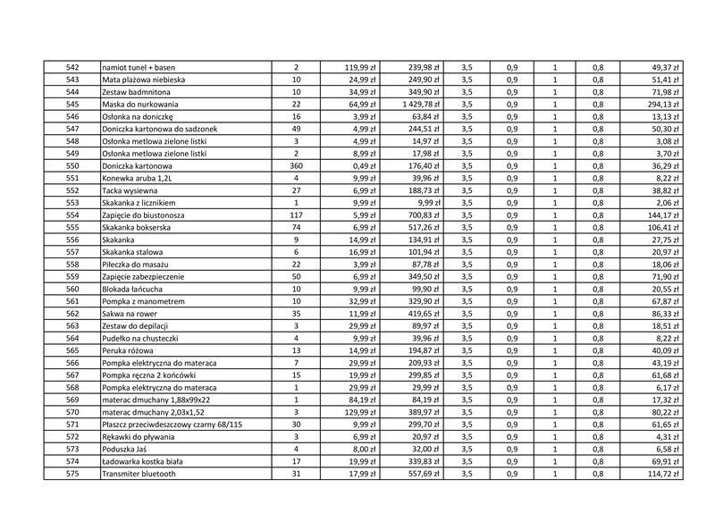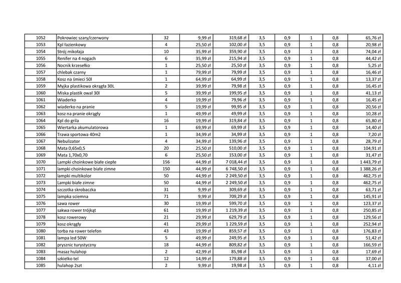 | 1 | Towar różnego asortymentu Wykaz ruchomości wraz z elaboratem szacunkowym znajduje się do wglądu w kancelarii komornika oraz umieszczony jest na stronie internetowej Krajowej Rady Komorniczej: licytacje.komornik.pl i na stronie internetowej komornika: komornikradom.eu. | 1 | 118 221,00 zł | 59 110,50 zł | 592,00 zł |
