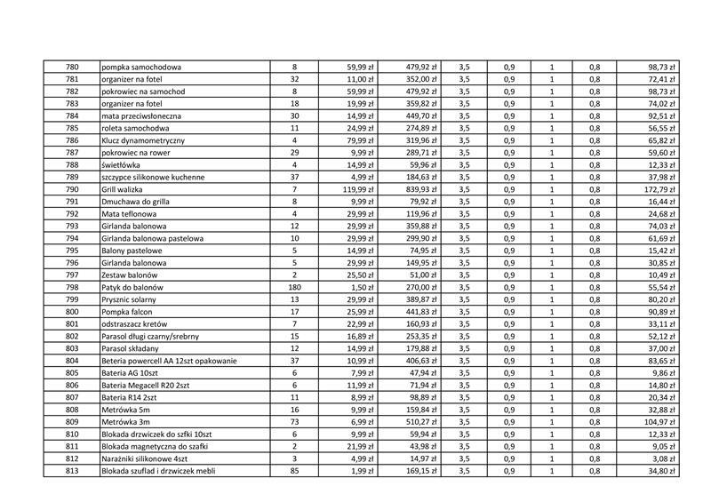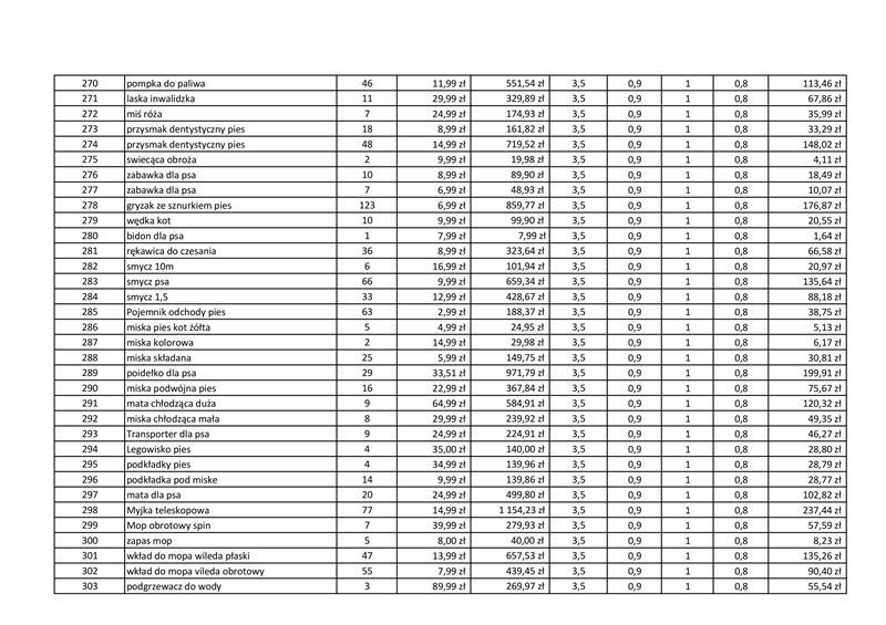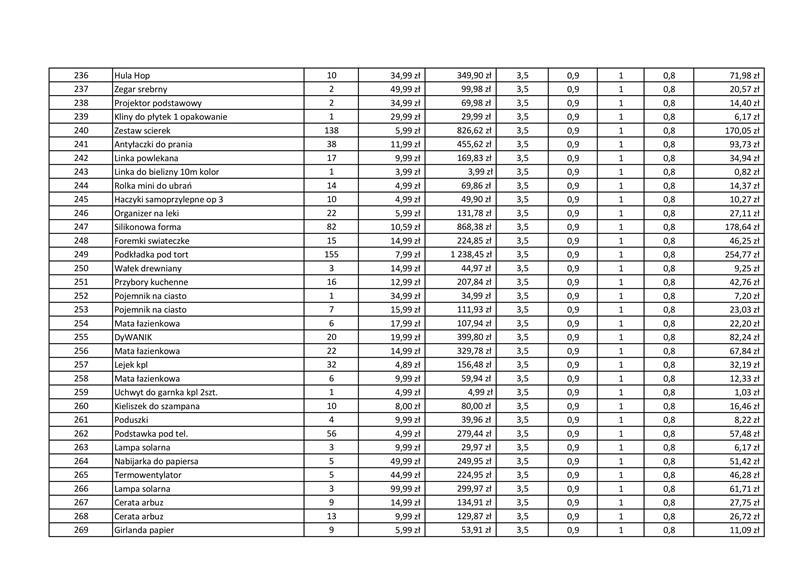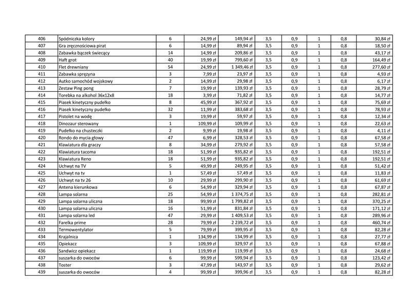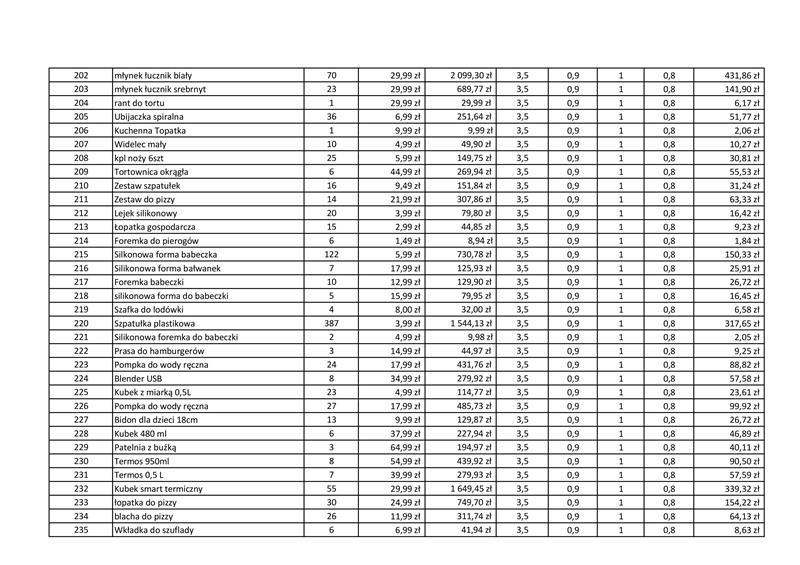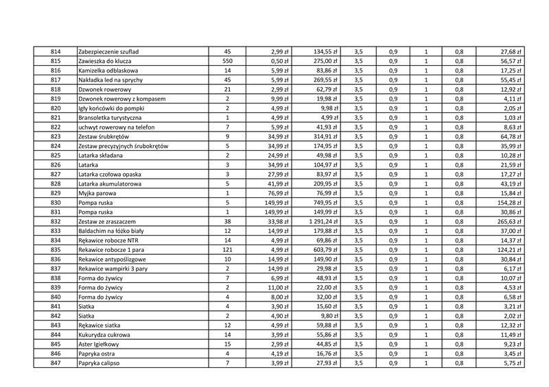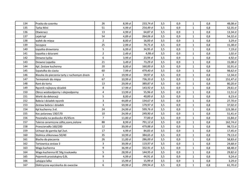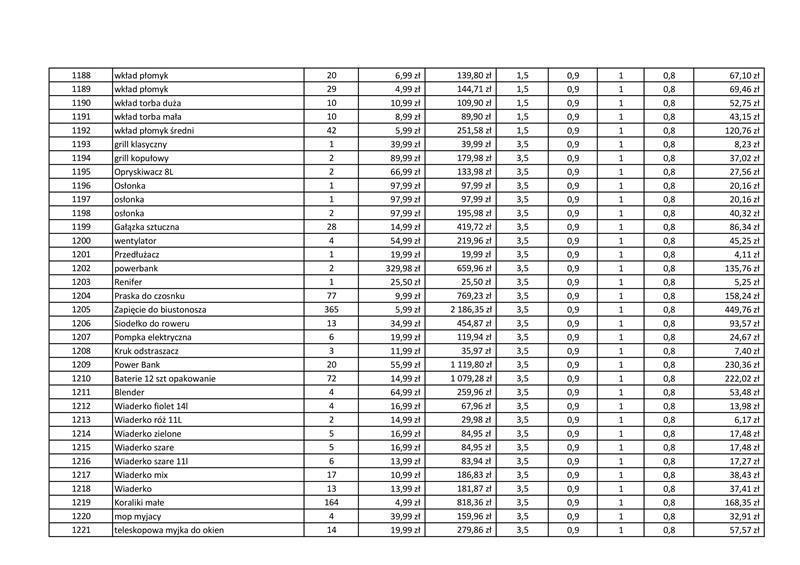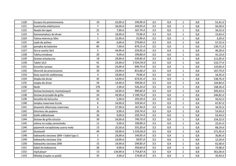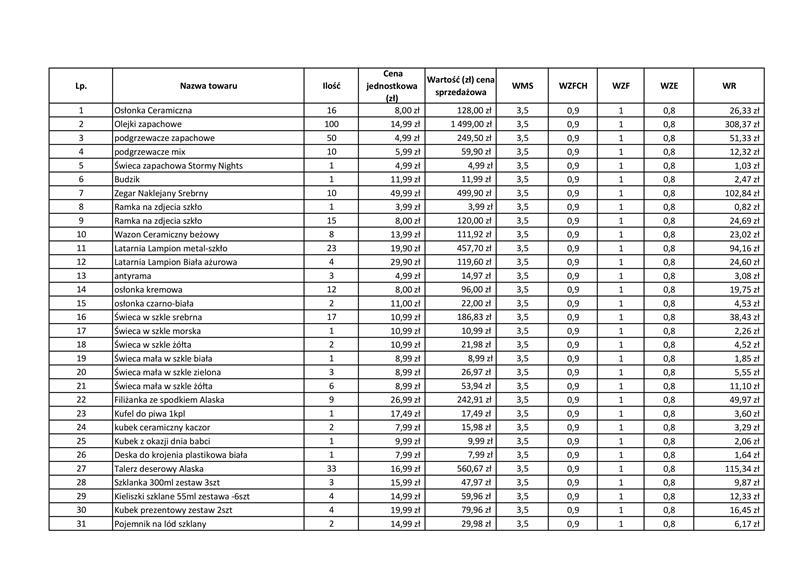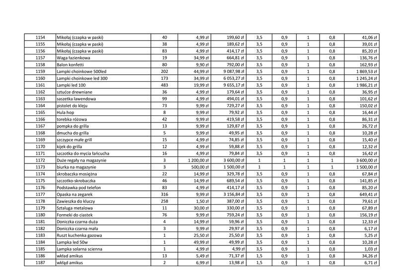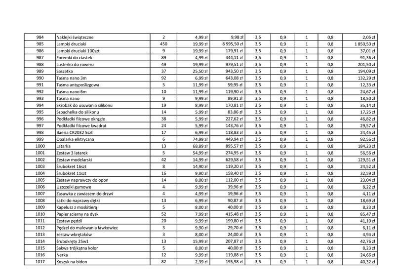 | 1 | Towar różnego asortymentu Wykaz ruchomości wraz z elaboratem szacunkowym znajduje się do wglądu w kancelarii komornika oraz umieszczony jest na stronie internetowej Krajowej Rady Komorniczej: licytacje.komornik.pl i na stronie internetowej komornika: komornikradom.eu. | 1 | 118 221,00 zł | 59 110,50 zł | 592,00 zł |