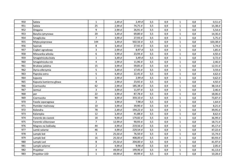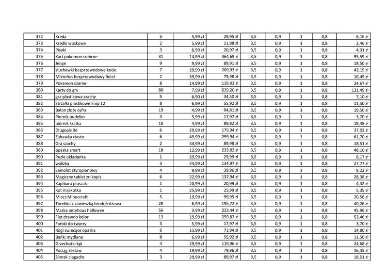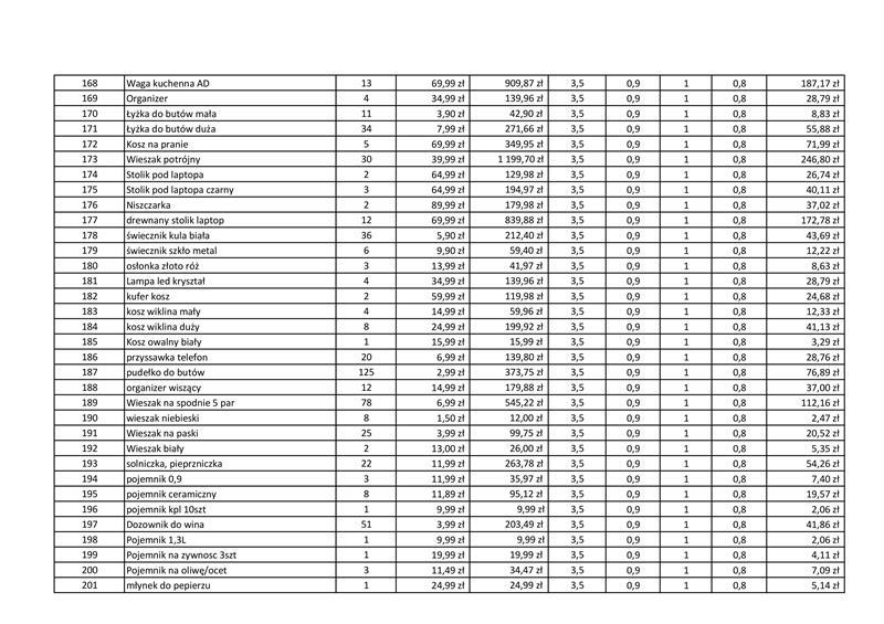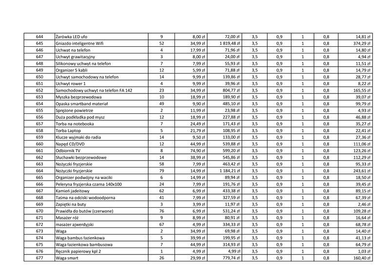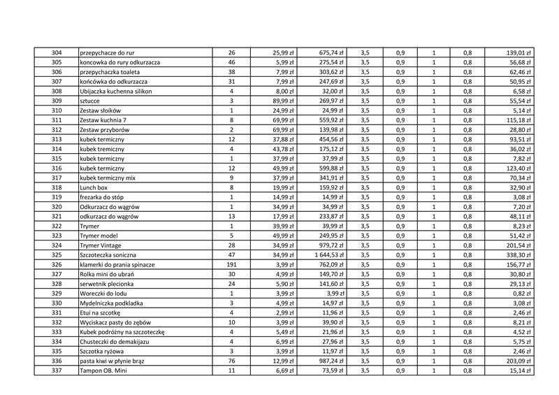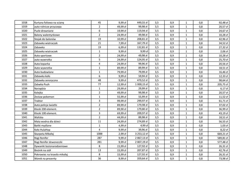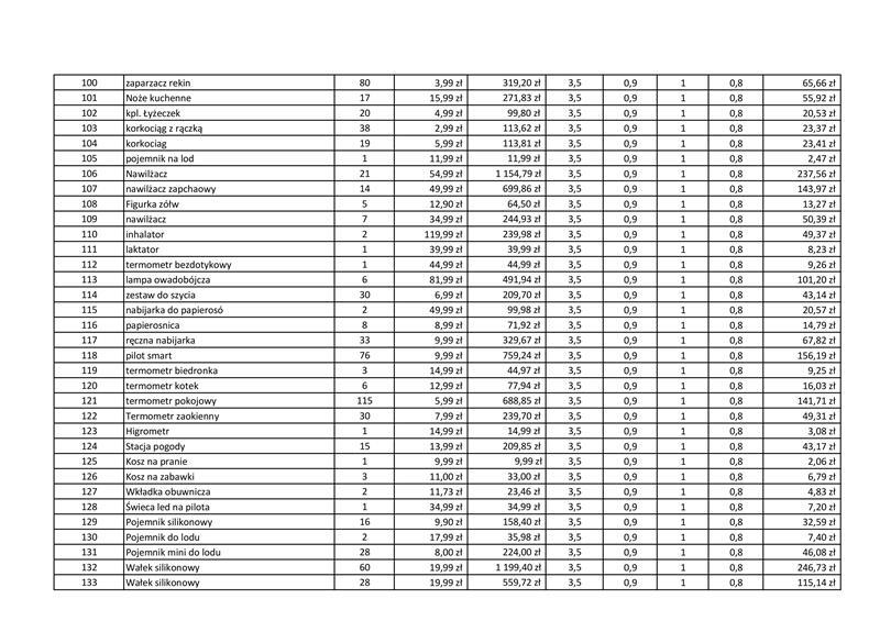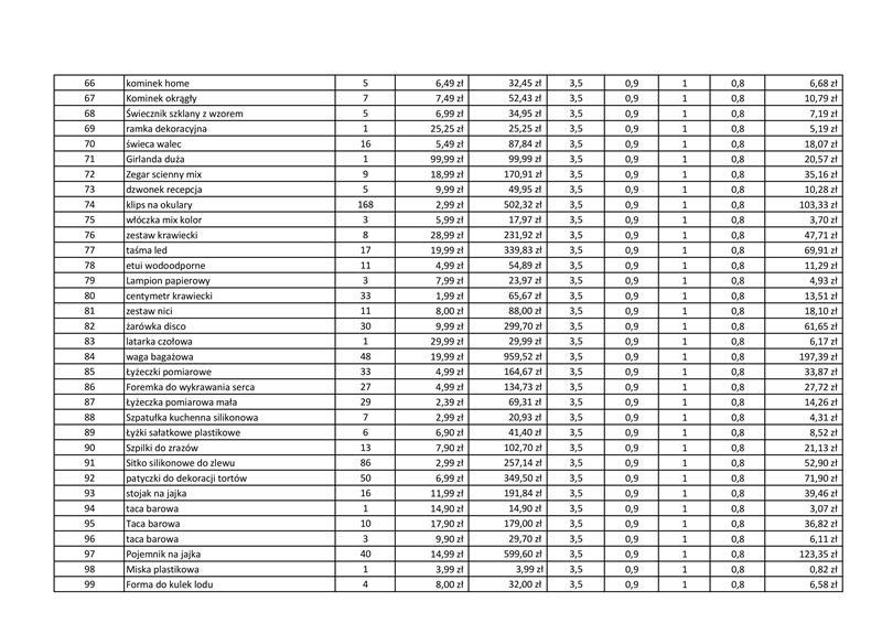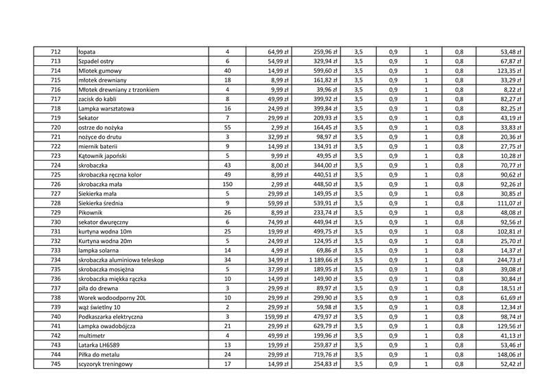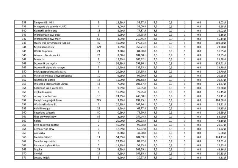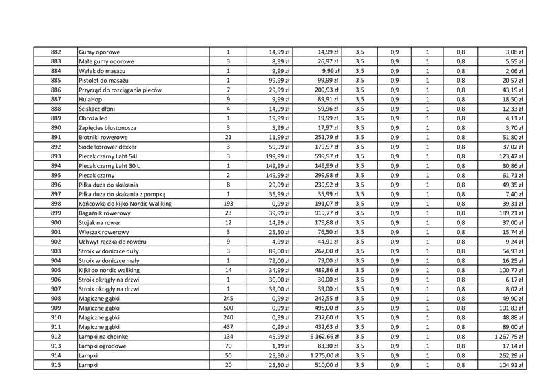| 1 | Towar różnego asortymentu Wykaz ruchomości wraz z elaboratem szacunkowym znajduje się do wglądu w kancelarii komornika oraz umieszczony jest na stronie internetowej Krajowej Rady Komorniczej: licytacje.komornik.pl i na stronie internetowej komornika: komornikradom.eu. | 1 | 118 221,00 zł | 59 110,50 zł | 592,00 zł |