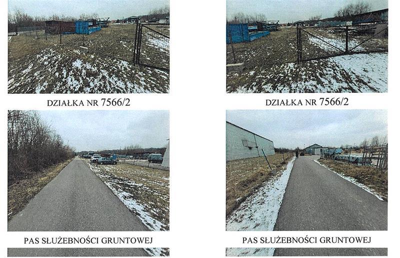 Działka nr 7566/2 ma regularny kształt i jest położona jest w pierwszej linii od ul. Łany. Teren w przybliżeniu płaski, niezabudowany, ogrodzony siatką stalową na słupkach stalowych. Na działce usytuowane są obiekty kubaturowe nietrwale związane z gruntem. Przez działkę przebiega gazociąg wysokiego ciśnienia. Brak ustanowionej służebności przesyłu związanej z przebiegiem niniejszej sieci. Działka od strony wschodniej bezpośrednio przylega do drogi gminnej- ul. Łany. Pozostałe działki nie posiadają bezpośredniego dostępu do drogi publicznej.