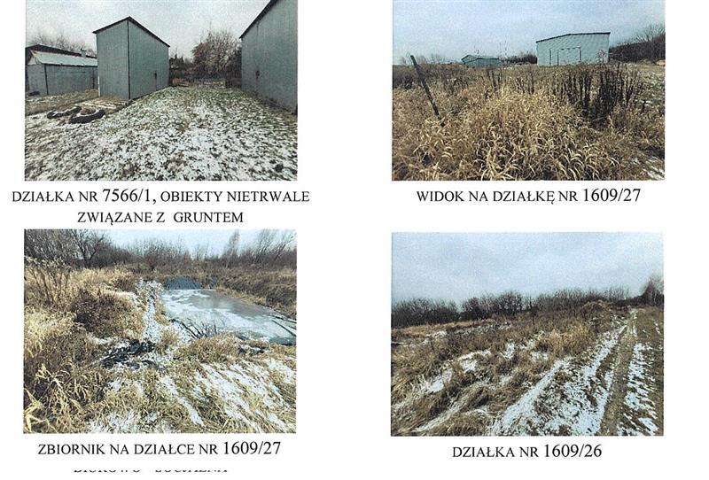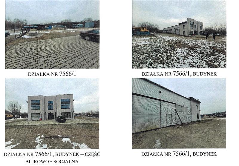 Działka nr 7566/1 ma kształt zbliżony od trapezu prostokątnego, wschodnią ścianą przylegającą do działki nr 7566/2, zachodnią częściowo do działki nr 1609/27. Na działce posadowiona część hali magazynowej (pow. 272 m2) oraz część biurowo - socjalna (w całości). Teren częściowo ogrodzony siatką stalową na słupkach betonowych, z bramą wjazdową w północno – wschodniej części. Teren przed budynkiem częściowo utwardzony kostką betonową, częściowo wysypany również żwir. Na działce usytuowane są obiekty kubaturowe nietrwale związane z gruntem. Na posesji studnia oraz zbiornik na nieczystości.