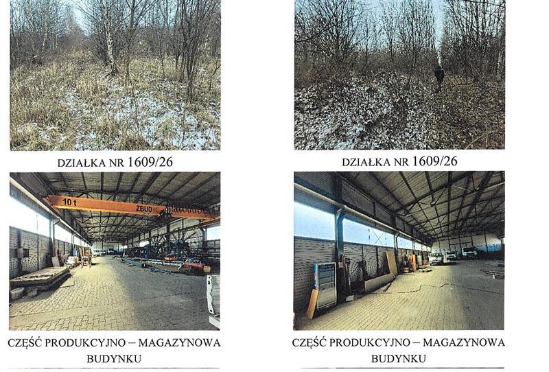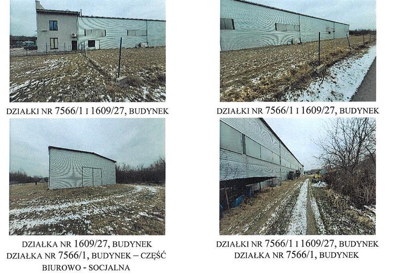 Na działkach nr 7566/1 i 1609/27 posadowiony budynek produkcyjno – magazynowy z częścią biurowo – socjalną. Łączna powierzchnia budynku (netto) wynosi 1219,37 m2 (w tym część produkcyjno – magazynowa 993,00 m2 i część biurowo - socjalna 226,37 m2). Hala produkcyjno - magazynowa częściowo posadowiona jest na działce nr 1609/27 (pow. 721 m2), częściowo na działce nr 7566/1 (pow. 272 m2) – brak fizycznego oddzielenia. Część produkcyjna parterowa, wykonana w technologii szkieletu stalowego. Ściany zewnętrzne z blachy trapezowej. Dach o konstrukcji stalowej, kryty blachą trapezową. Wewnątrz posadzka z kostki betonowej. Dwie bramy wjazdowe stalowe. Wysokość suwnicy wynosi 5,38 m, wysokość w szczycie hali wynosi 8,26 m. Część socjalno – biurowa bezpośrednio przylega do wschodniej ściany hali. Obiekt o pow. zabudowy 134 m2, położony frontowo do ul. Łany, o 2 kondygnacjach nadziemnych, niepodpiwniczony. Rozkład pomieszczeń przedstawia się następująco: parter: szatnia: 13,45m², prysznic: 7,84m², wc: 1,33m², biuro: 12,24m², biuro: 63,07m², łazienka: 3,45 m², wc: 2,04m², klatka schodowa: 15,15m²; I piętro: biuro: 41,61m², biuro: 23,81m², biuro 15,65m², archiwum: 3,88m², wc: 2,85m², magazyn: 20,00m².