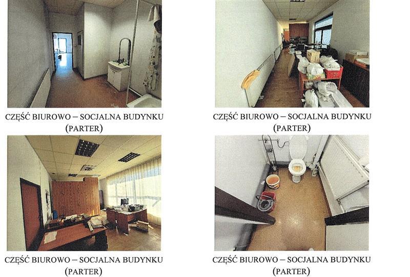Część biurowo – socjalna wykonana w technologii tradycyjnej murowanej z pustaka ceramicznego. Brak tynku zewnętrznego. Dach o konstrukcji drewnianej, kryty blachą. Od strony ul. Łany duże przeszklenia. Stolarka okienna, drzwi wejściowe PCV. Stolarka drzwiowa wewnętrzna typowa. Posadzki wyłożone panelami, płytkami lub okładzinami z tworzyw sztucznych. Schody wewnętrzne na piętro z okładziną z paneli podłogowych. Ściany wewnętrzne otynkowane i pokryte powłokami malarskimi. Sufity podwieszane, kasetonowe z oświetleniem. W sanitariatach ściany częściowo wyłożone płytkami ceramicznymi. Niektóre z pomieszczeń na parterze wymagając odświeżenia. Instalacje wewnętrzne: elektryczna, wodna, kanalizacyjna, c.o. (na paliwo stałe), klimatyzacja, monitoring.