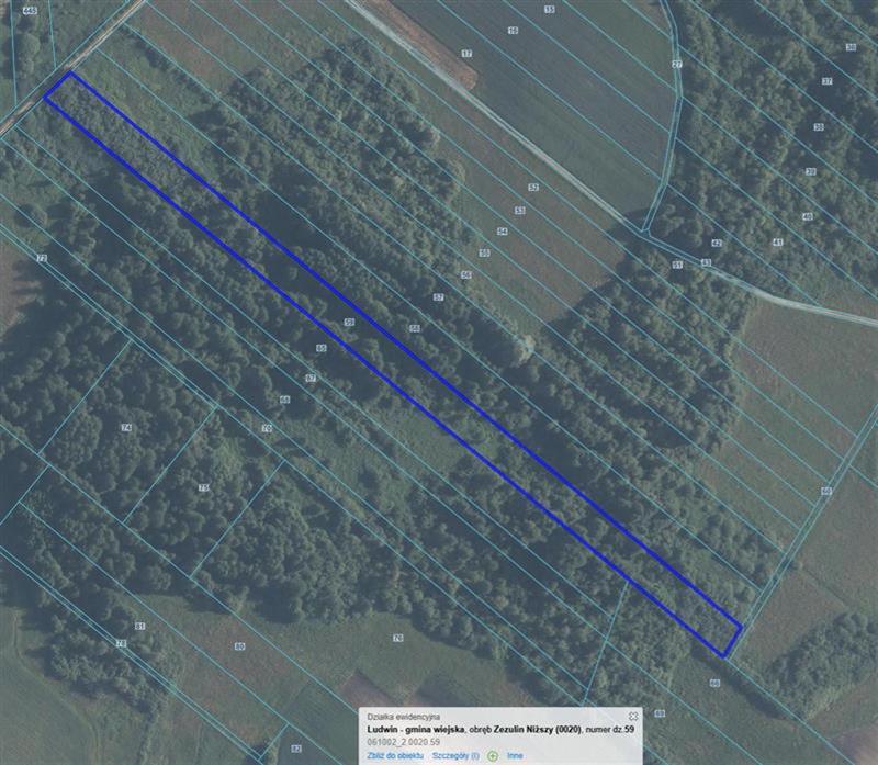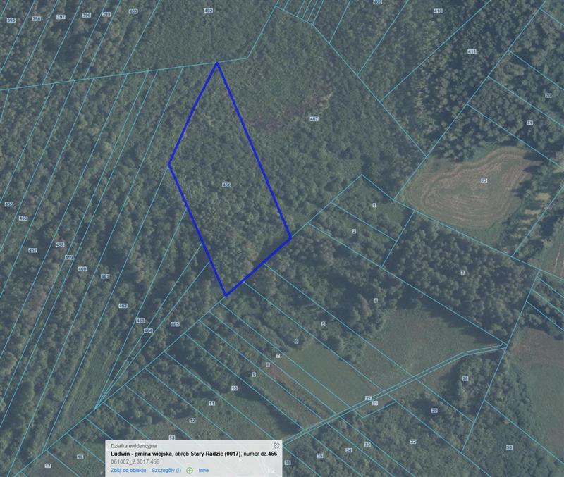 Działka nr 466 położona w miejscowości Radzic Stary o powierzchni 1,19 ha w kształcie nieregularnego czworokąta zbliżonego do trapezu prostokątnego. Działka nieużytkowana rolniczo, roślinność krzewiasta i trawiasta, w części skupiska drzew liściastych. Teren płaski. W otoczeniu i sąsiedztwie tereny nieużytkowane rolniczo. W bliższej i dalszej odległości brak zabudowy siedliskowej, zagrodowej. Powierzchnia klasy gruntów: 1,17 ha - E-ŁVI - użytki ekologiczne na łąkach trwałych, 0,02 ha - E-W-ŁVI - użytki ekologiczne na gruntach zajętych pod rowy. Brak oznaczeń geodezyjnych. Działka nieuzbrojona. Działka nr 59 położona w miejscowości Zezulin Niższy o powierzchni 1,0547 ha w kształcie wydłużonego prostokąta. Działka nieużytkowana rolniczo, roślinność krzewiasta i trawiasta, w części skupiska drzew liściastych. Teren płaski. W otoczeniu i sąsiedztwie tereny nieużytkowane rolniczo, Brak zabudowy siedliskowej, zagrodowej. Powierzchnia klasy gruntów: 1,0547 ha - Lzr-ŁIV- grunty zadrzewione i zakrzewione na użytkach rolnych. Brak oznaczeń geodezyjnych. Działka nieuzbrojona. Obszar na którym znajduje się nieruchomość posiada Miejscowy Plan Zagospodarowania Przestrzennego i jest użytkowana zgodnie z jego przeznaczeniem. Według MPZP Gminy Ludwin obszar nieruchomości został określony wg oznaczenia graficznego jako: „RZ” – łąki i pastwiska.