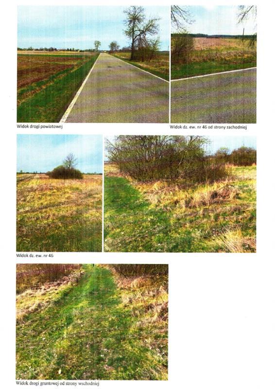 Działka ew. nr 46 z miejscowości Zaborów położona jest w części około 0,01 ha w terenie określonym jako KD (DG-L) – tereny dróg gminnych lokalnych, a w pozostałej części w terenie określonym jako RZ – tereny użytków zielonych (łąk i pastwisk). Zgodnie z zapisem w ewidencji gruntów dz. ew. nr 46, obręb Zaborów posiada pow.0,87 ha. Są to łąki trwałe ŁIII, ŁIV. Stwierdzono zgodność zapisów KW z zapisami w ewidencji gruntów. Stan techniczno – użytkowy: Działka gruntu o nr ew. 46 posiada pow. 8700 m2. Działka o nieregularnym mocno wydłużonym kształcie, dł. ok 490 m. Teren płaski. Działka przylega do powiatowej drogi asfaltowej od strony zachodniej oraz do drogi gruntowej gminnej od strony wschodniej. Stan zagospodarowania: Działka jest niezabudowana i nie ogrodzona. Działka porośnięta chwastami i pojedynczą samosiejką.