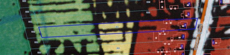Działka ewidencyjna 263 jest w kształcie prostokąta o szerokości około 14 metrów. Działka we frontowej części ogrodzona. Prawdopodobnie: woda, energia, szambo. We frontowej części budynek mieszkalny oraz zabudowa gospodarcza na powierzchni około 60m2. Nieruchomość posiada bezpośredni dostęp do drogi publicznej asfaltowej. We frontowej części grunt ziemny nie utwardzony z zadrzewieniami i nasadzeniami oraz z zabudową mieszkaniową gospodarczą. Działka poza częścią zabudowy – nie użytkowana rolniczo. Od północnej strony granica z działką 262, od południowej strony z działką 264, od wschodu granicę stanowi droga asfaltowa, natomiast od zachodu nieużytki, działka 237.
