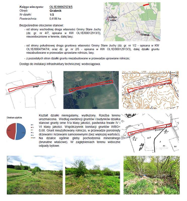 Przedmiotem licytacji jest prawo własności do niezabudowanej nieruchomości gruntowej, położonej w obrębie Grabnik, gmina Stare Juchy, opisanej w księdze wieczystej prowadzonej przez Sąd Rejonowy w Ełku o nr KW OL1E/00067674/5, stanowiącej działkę gruntu nr 1/3 o pow. 0,4186 ha.