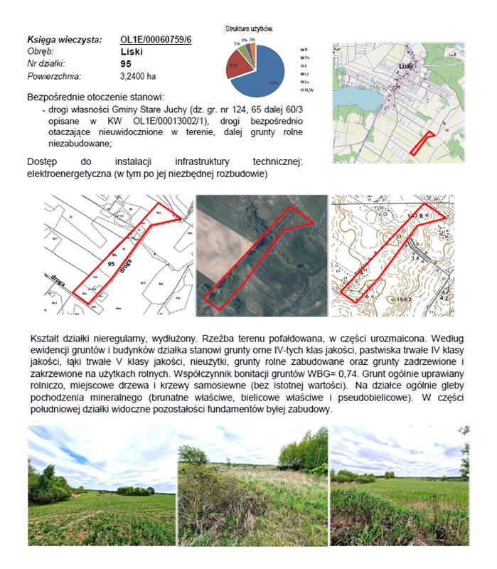 Przedmiotem licytacji jest prawo własności do niezabudowanej nieruchomości gruntowej, położonej w obrębie Liski, gmina Stare Juchy, opisanej w księdze wieczystej prowadzonej przez Sąd Rejonowy w Ełku o nr KW OL1E/00060759/6, stanowiącej działkę gruntu nr 95 o pow. 3,2400 ha.