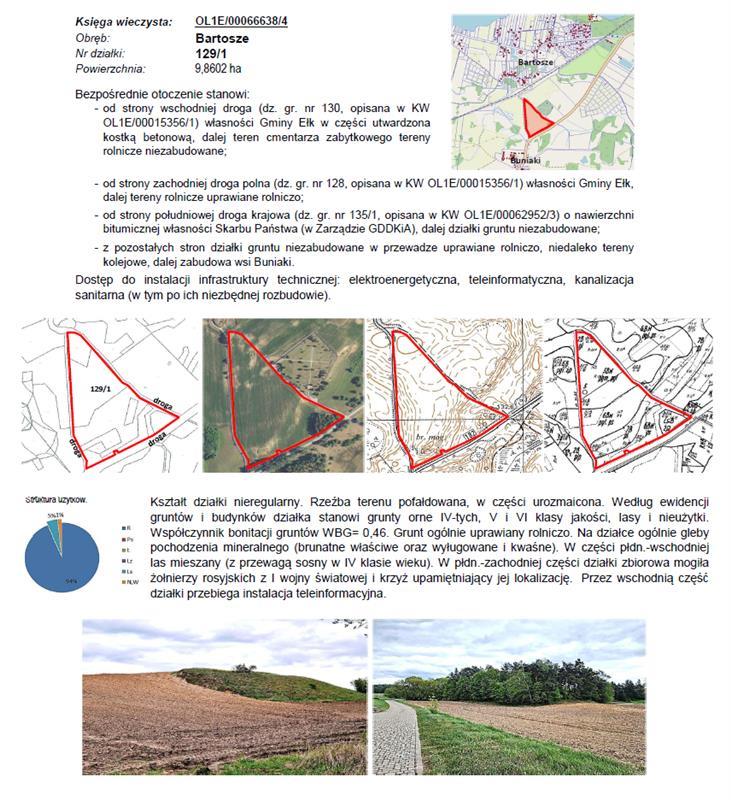 Przedmiotem licytacji jest prawo własności do niezabudowanej nieruchomości gruntowej, położonej w obrębie Bartosze, gmina Ełk, opisanej w księdze wieczystej prowadzonej przez Sąd Rejonowy w Ełku o nr KW OL1E/00066638/4, stanowiącej działkę gruntu nr 129/1 o pow. 9,8602 ha.