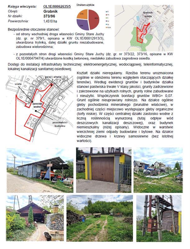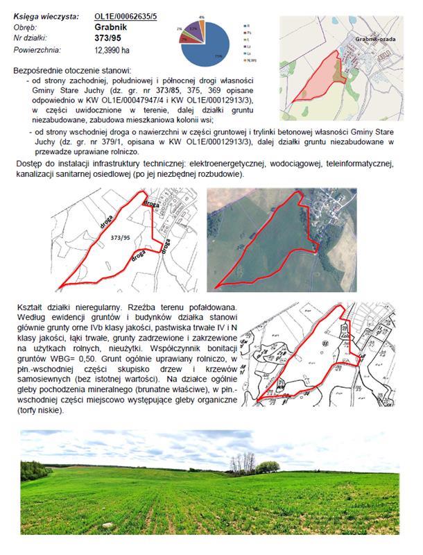 Przedmiotem licytacji jest prawo własności do zabudowanej nieruchomości, położonej w obrębie Grabnik, gmina Stare Juchy, opisanej w księdze wieczystej prowadzonej przez Sąd Rejonowy w Ełku o nr KW OL1E/00062635/5, stanowiącej niezabudowaną działkę gruntu nr 373/95 o pow. 12,3990 ha oraz zabudowaną działkę gruntu nr 373/96 o pow. 1,4510 ha.
