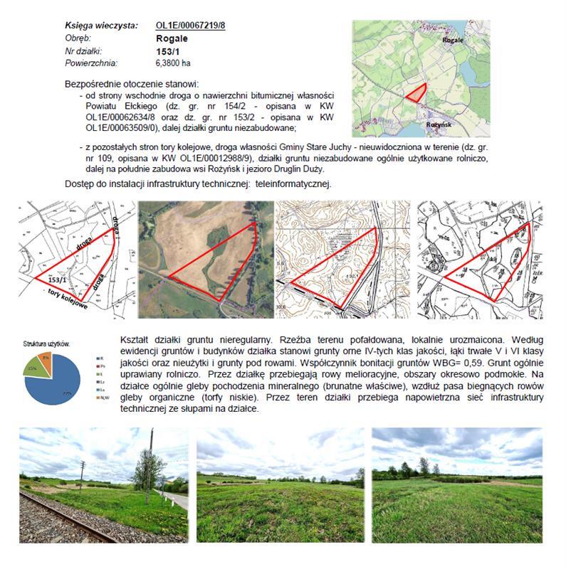 Przedmiotem licytacji jest prawo własności do niezabudowanej nieruchomości gruntowej, położonej w obrębie Rogale, gmina Stare Juchy, opisanej w księdze wieczystej prowadzonej przez Sąd Rejonowy w Ełku o nr KW OL1E/00067219/8, stanowiącej działkę gruntu nr 153/1 o pow. 6,3800 ha.