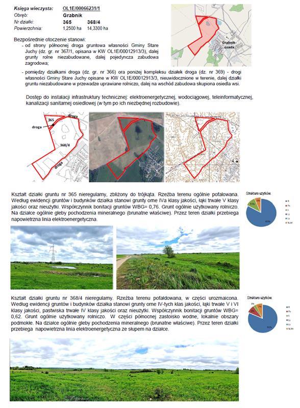 Przedmiotem licytacji jest prawo własności do niezabudowanej nieruchomości gruntowej, położonej w obrębie Grabnik, gmina Stare Juchy, opisanej w księdze wieczystej prowadzonej przez Sąd Rejonowy w Ełku o nr KW OL1E/00066231/1, stanowiącej działkę gruntu nr 365 o pow. 1,2500 ha oraz działkę gruntu nr 368/4 o pow. 14,3300 ha.