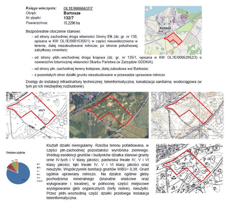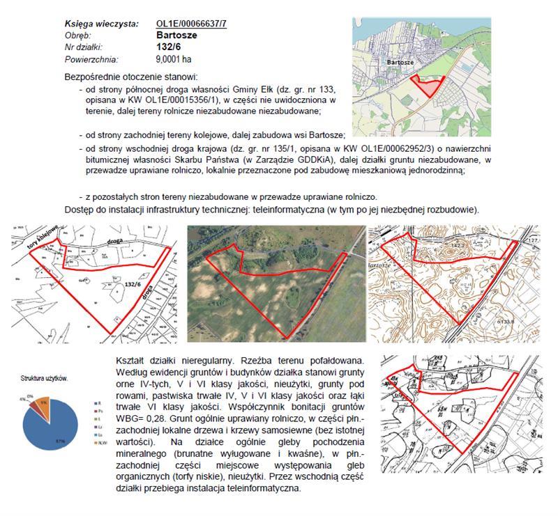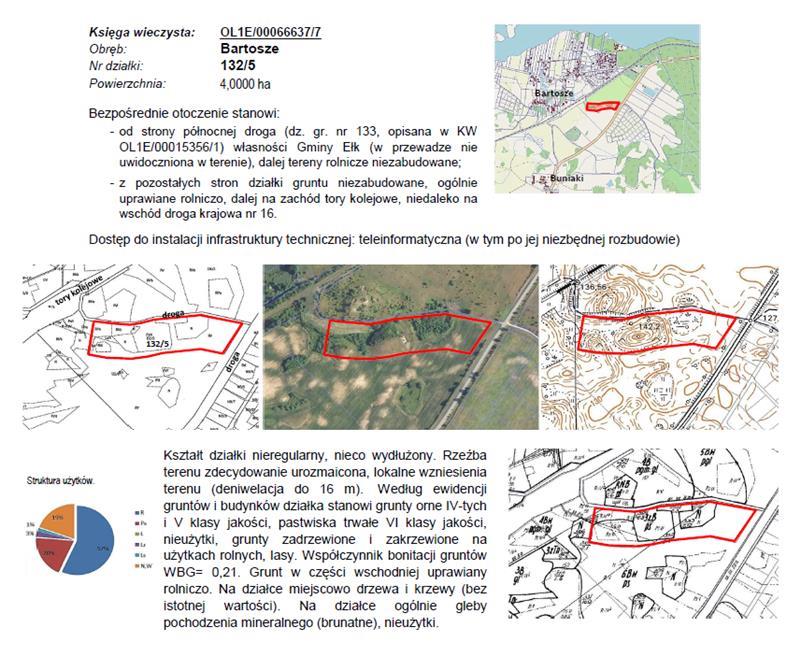 Przedmiotem licytacji jest prawo własności do niezabudowanej nieruchomości gruntowej, położonej w obrębie Bartosze, gmina Ełk, opisanej w księdze wieczystej prowadzonej przez Sąd Rejonowy w Ełku o nr KW OL1E/00066637/7, stanowiącej działkę gruntu nr 132/5 o pow. 4,0000 ha, działkę gruntu nr 132/6 o pow. 9,0001 ha i działkę gruntu nr 132/7 o pow. 15,2296 ha.