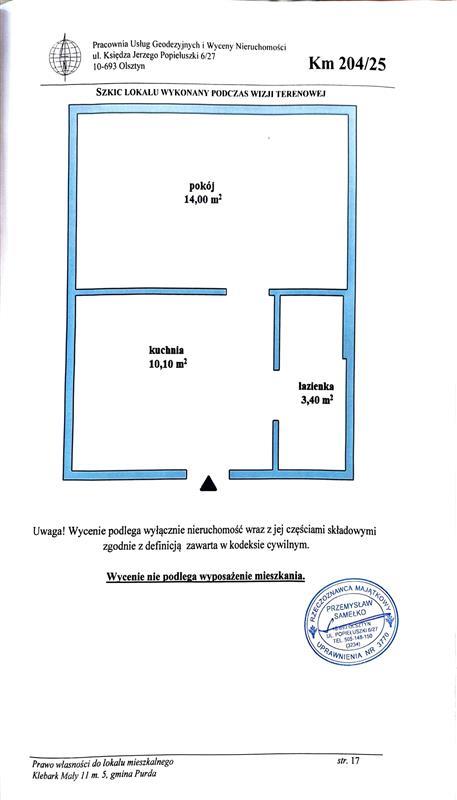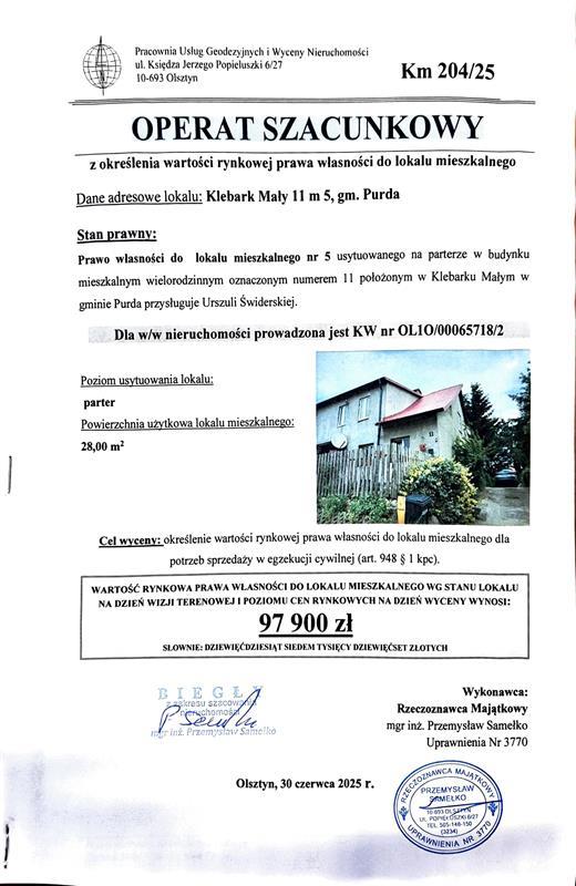 - lokalu mieszkalnego położonego przy 11/5,Klebark Mały, 11-030 Purda, dla którego Sąd Rejonowy w Olsztynie VI Wydział Ksiąg Wieczystych (adres: ul. Dąbrowszczaków 44, Olsztyn, 10-543 Olsztyn) prowadzi księgę wieczystą o numerze OL1O/00065718/2.