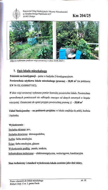 Przedmiotowy lokal znajduje się na parterze w budynku 2-kondygnacyjnym. Składa się z pokoju, kuchni i łazienki. Powierzchnia użytkowa lokalu wynosi: 28,00 m2.