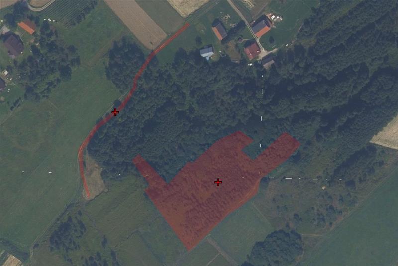 3. działka 2785 o pow. 800m2. Działka o nieregularnym kształcie, użytkowana jako rolna. Jej północną częścią przebiega potok, posiada bezpośredni dostęp do drogi publicznej (użytek-ŁIII-0,05 ha, PsIV-0,03 ha). Cena oszacowania 5000,00 zł, cena wywołania 2500 zł.