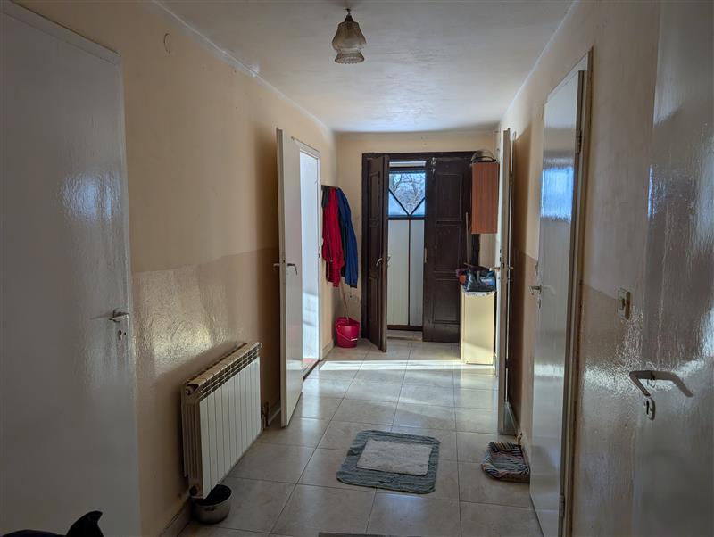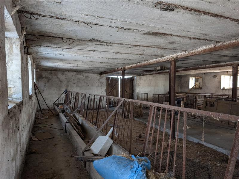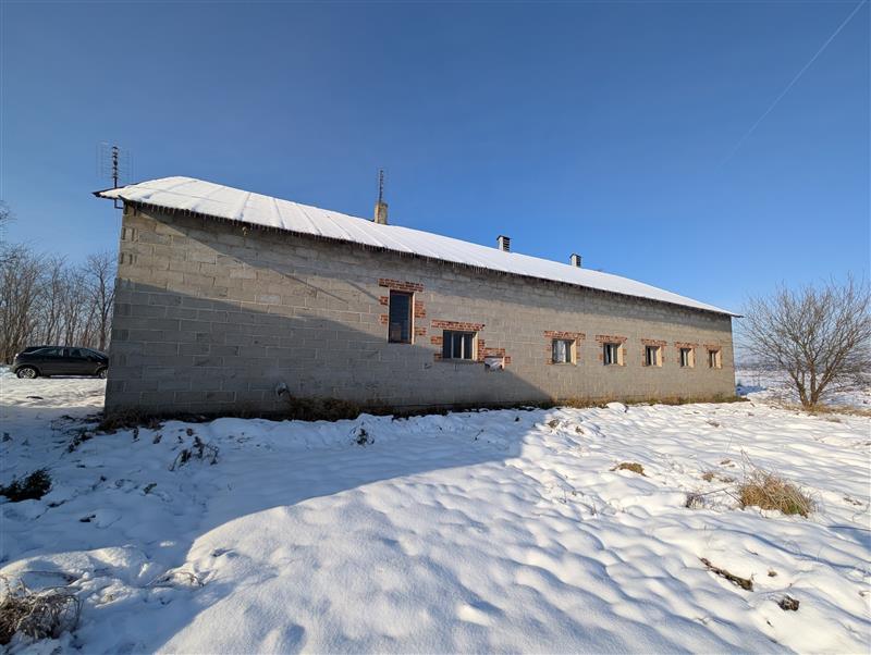 BUDYNEK GOSPODARCZO-INWENTARSKI ma powierzchnię zabudowy 112 m2. Jest murowany z bloczków betonowo – żużlowych. Dach – konstrukcja drewniana, dwuspadowy pokryty dachówką betonową z licznymi ubytkami. Drzwi i wrota wjazdowe są z desek drewnianych. Budynek z lat 50. Stan budynku średni. Oględziny nieruchomości po wcześniejszym uzgodnieniu telefonicznym z komornikiem.