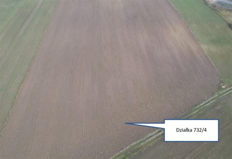 Działka 732/4 o powierzchni 0,1662 HA. Działka o regularnym kształcie zbliżonym do równoległoboku. Teren działki o niewielkim nachyleniu. Na dzień dokonania oględzin nieruchomość nieuzbrojona. Na wschód w odległości ok 165 m w drodze gminnej nr 121108E zapewniony dostęp do sieci elektroenergetycznej oraz sieci wodociągowej. Teren działki o niewielkim nachyleniu w z północy w kierunku z południa, brak elementów które ograniczałby korzystanie z nieruchomości zgodne z przeznaczeniem