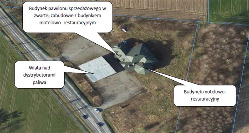 Nieruchomość komercyjna o powierzchni 21.000 m 2, nr ewidencyjny działek 184,185. Nieruchomość zabudowana budynkiem stacji paliw z restauracją i hotelem pod jednym dachem. Budynek jednokondygnacyjny, niepodpiwniczony z użytkowym poddaszem: powierzchnia użytkowa części stacji paliw-198 m2,