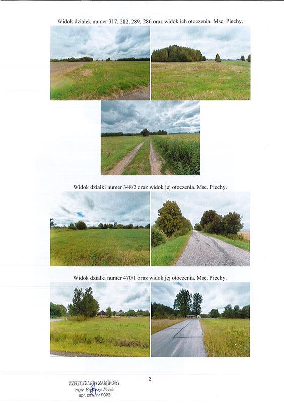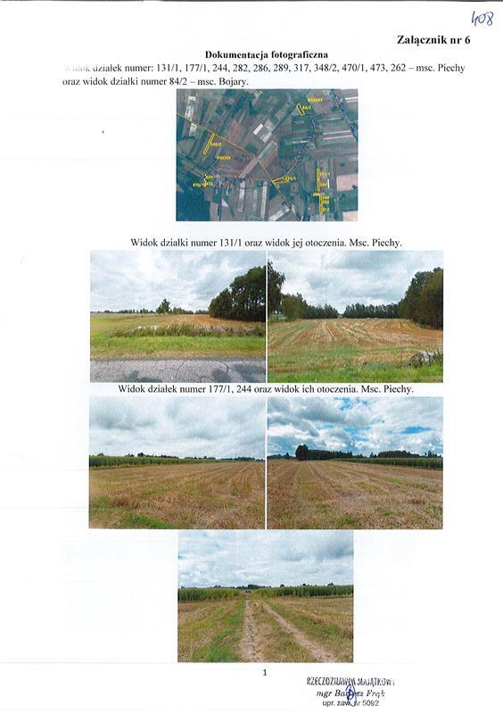6. działki nr 289 (grunty orne RV ) o pow, 0,08 ha położonej w msc. Piechy. Suma oszacowania wynosi 2.790,00 zł, zaś cena wywołania jest równa 3/4 sumy oszacowania i wynosi 2.092,50 zł