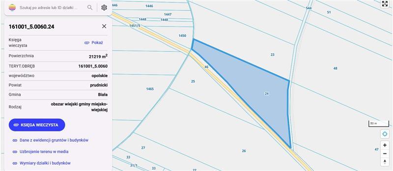 - nieruchomości położonej przy 0,Olbrachcice, 48-210 Biała, dla której Sąd Rejonowy w Prudniku Wydział Ksiąg Wieczystych (adres: ul. Ul. Kościuszki 5, Prudnik, 48-200 Prudnik) prowadzi księgę wieczystą o numerze OP1P/00050241/2.