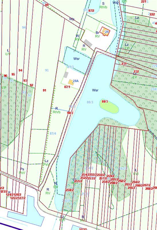 Działka zabudowana nr 87/3 - Użytki: RIVb - 0,3651 ha, RV- 0,0737 ha, ŁIV - 0,1531 ha, W-RV - 0,0221 ha, Wsr - 0,1491 ha. Razem powierzchnia działki – 0,7631 ha. Wymiary działki wynoszą: średnio 50 metrów szerokości i około 153 metrów szerokości. Działka dłuższym bokiem przylega od strony wschodniej do drogi publicznej. Teren działki płaski, wysoki poziom wód gruntowych. Grunt stabilny, piaszczysty. W północnej części działki użytki rolne, tereny zadarnione – pastwiska. Przy wschodniej granicy, wzdłuż drogi publicznej znajduje się staw rybny ze spiętrzeniem, groblą i mnichem przy północnej granicy stawu. Rów spustowy ze stawu przebiegający w kierunku północnym przez działkę. Zasilanie wodą przelewem, ze stawu sąsiedniego położonego po drugiej stronie drogi gminnej. W północnej części pojedyncze zadrzewienia i zakrzaczenia. Staw rybny o powierzchni 1491 mkw. Na północnej części działki stare wiaty i zadaszenia przy stawie. W centralnej części działki, w odległości około 20 m. od granicy stawu, posadowiony jest budynek mieszkalny, jednorodzinny. Budynek parterowy z poddaszem, niepodpiwniczony, wolnostojący. Płyta fundamentowa betonowa. Ściany konstrukcji drewnianej, od zewnątrz oszalowane deskami, od wewnątrz wykończone karton-gipsem i boazerią. Kominy murowane z cegły pełnej. Obok budynku od strony zachodniej ciąg blaszanych garaży (obiekty nie związane trwale z gruntem, nie będące przedmiotem wyceny). Dojazd i dojście do budynku oraz opaska wokół budynku utwardzona grubym, płukanym żwirem. Wokół budynku szpalery kilkunastoletnich tui oraz ozdobne nasadzenia świerków srebrzystych i krzewów ozdobnych