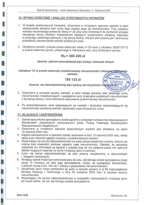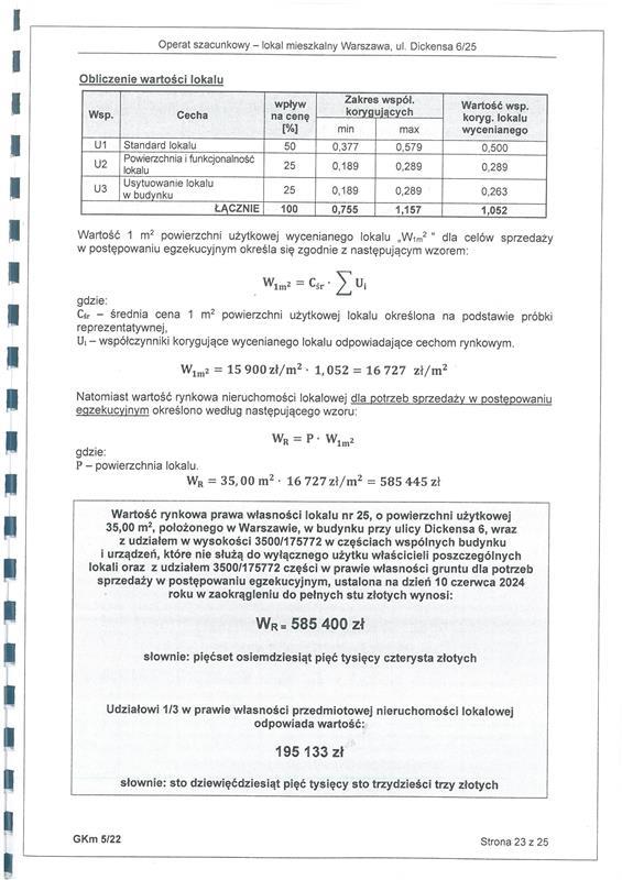 udziału wynoszącego 1/3 części lokalu mieszkalnego stanowiącego odrębną nieruchomość położonego pod adresem: 02-107 Warszawa, ul. Karola Dickensa 6/25, Warszawa, dla którego Sąd Rejonowy dla Warszawy Mokotowa VI Wydział Ksiąg Wieczystych prowadzi księgę wieczystą o numerze WA1M/00106142/4 o powierzchni użytkowej 35,00 m2, będącego własnością dłużnika