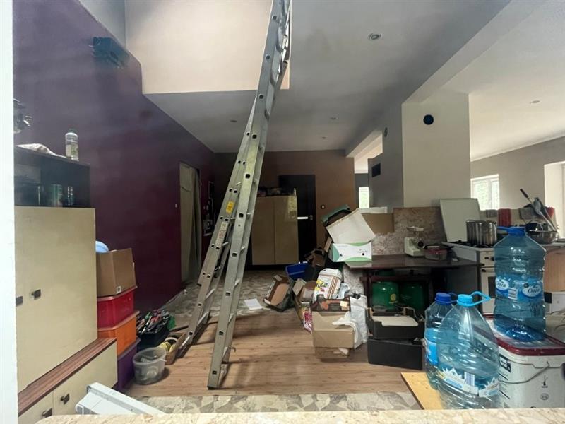 Wg oględzin stwierdza się remont pomieszczenia przyjętego jako salon: wykończenie ścian i podłogi, rozprowadzone oświetlenie, położony nowy dach oraz wsady kominowe i wentylacyjne ponad poziomem połaci. Na części dachu od strony południowo-zachodniej widoczne zamontowane panele fotowoltaiczne. Zamontowana została także konstrukcja na urządzenie i zadaszenie tarasu.