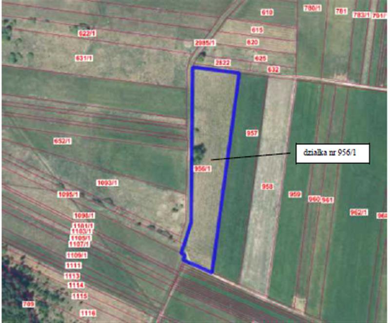 Nieruchomość gruntowa położona w miejscowości Jakimowice, gmina Radoszyce, powiat konecki, województwo świętokrzyskie, składająca się z działki oznaczonej w ewidencji gruntów numerem 956/1 o powierzchni 0,0800 ha, dla której Sąd Rejonowy w Końskich IV Wydział Ksiąg Wieczystych prowadzi księgę wieczystą Kw. Nr KI1K/0002154/4. Działka numer 956/1 o powierzchni 0,8000 ha w kształcie prostokąta o szerokości frontu około 37,50 metrów i długości około 213 metrów. Działka nie jest zabudowana, nie jest ogrodzona, jest użytkowana rolniczo – łąka. Na działce jest duże nasłonecznienie, jest brak wody. Teren działki płaski. Dla działki oznaczonej w ewidencji gruntów numerem geodezyjnym 956/1 obręb Jakimowice, gmina Radoszyce nie obowiązuje Plan Zagospodarowania Przestrzennego. Natomiast zgodnie ze Studium uwarunkowań i kierunków zagospodarowania przestrzennego Gminy Radoszyce zatwierdzonym Uchwałą Nr XX/109/2016 Rady Gminy Radoszyce z dnia 27 września 2016 roku przeznaczenie w/w działki jest następujące: 956/1 - „Tereny gruntów rolnych i sadów”. Działka numer 956/1 w kształcie prostokąta w usytuowaniu narożnym, przylega do dróg gruntowych, jednym z krótszych boków od strony północnej przylega do drogi gruntowej działki nr 1087, od strony południowej do działki nr 2906/1, a od strony zachodniej całym dłuższym bokiem przylega do działki nr 2985/1, w zarządzie Gminy Radoszyce, będące drogami wewnętrznymi, nie posiadającymi statusu dróg publicznych. Działka numer 956/1 położona jest w terenie bez dostępu infrastruktury technicznej. Działka numer 956/1 – sąsiedztwo i otoczenie to tereny rolne niezabudowane.