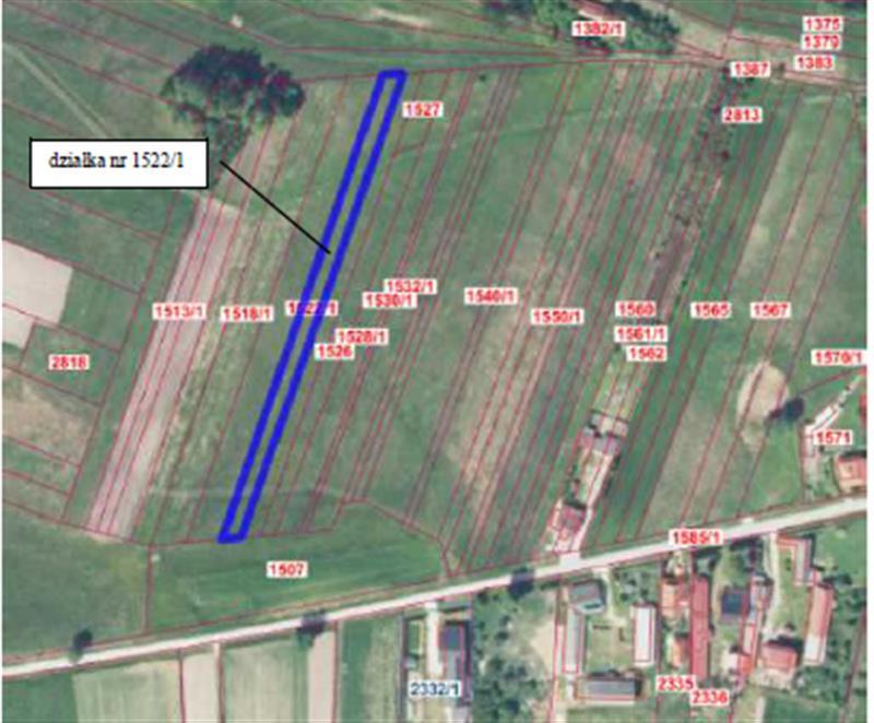 Nieruchomość gruntowa położona w miejscowości Jakimowice, gmina Radoszyce, powiat konecki, województwo świętokrzyskie, składająca się z działki oznaczonej w ewidencji gruntów numerem, 1522/1 o powierzchni0,1700 ha, dla której Sąd Rejonowy w Końskich IV Wydział Ksiąg Wieczystych prowadzi księgę wieczystą Kw. Nr KI1K/0002154/4. Działka numer 1522/1 o powierzchni 0,1700 ha w kształcie prostokąta o szerokości frontu około 8 metrów i długości około 22 metrów. Działka nie jest zabudowana, nie jest ogrodzona, jest użytkowana rolniczo – łąka. Teren działki płaski. Przy działce w poprzek przechodzi rów.