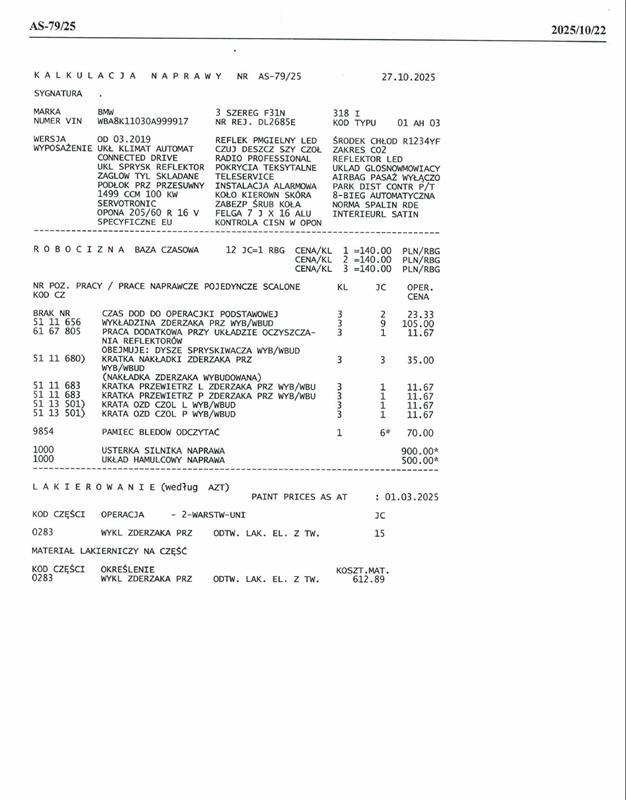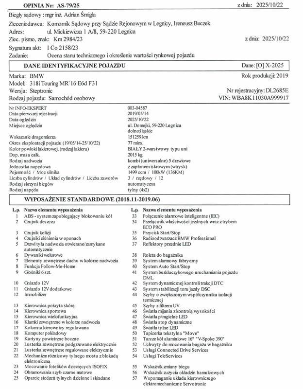 Nazwa ruchomości: BMW 318I Touring MR'16 kombi, nr rej. DL2685E, VIN WBA8K11030A999917, rok produkcji 2019, silnik 1499 ccm, 136 KM, przebieg 151 259 KM (1 sztuka)