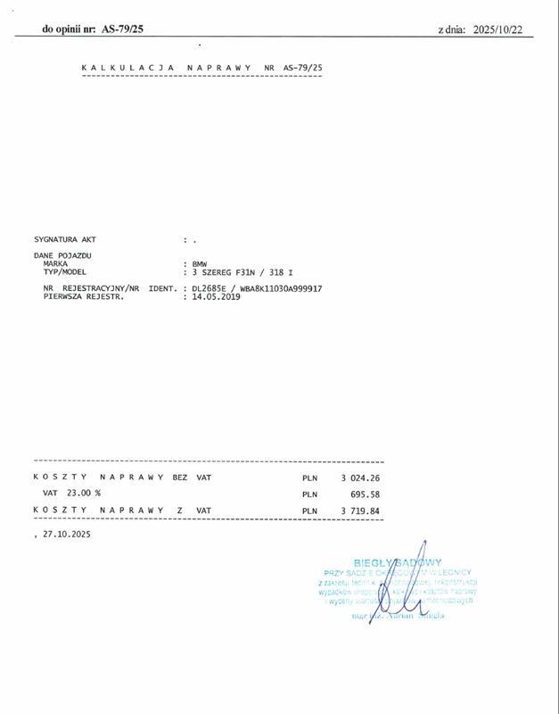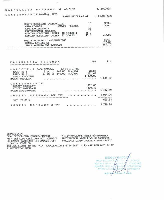 Wysokość kosztów ewentualnej naprawy pojazdu oszacowano na kwotę 3 720,00 zł