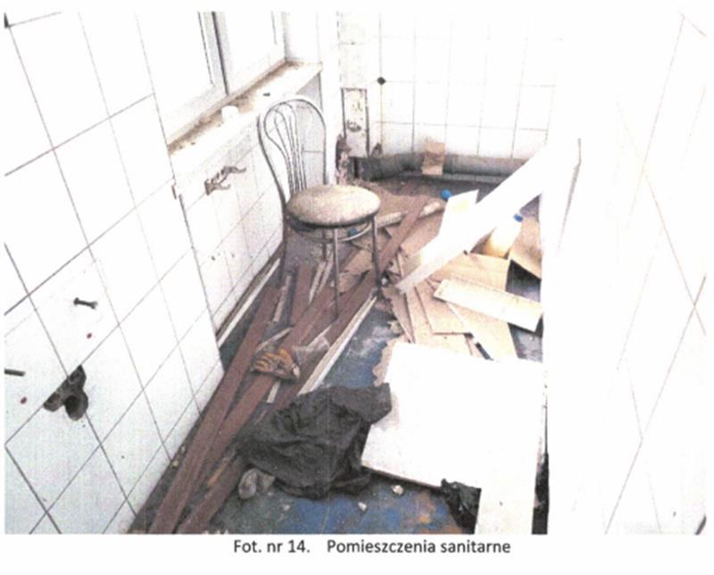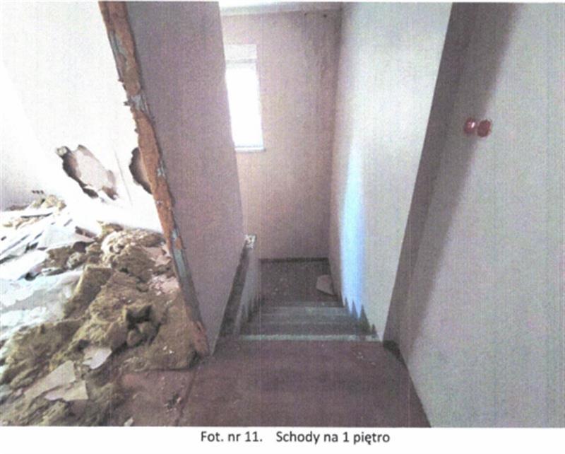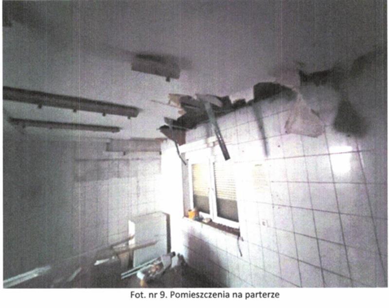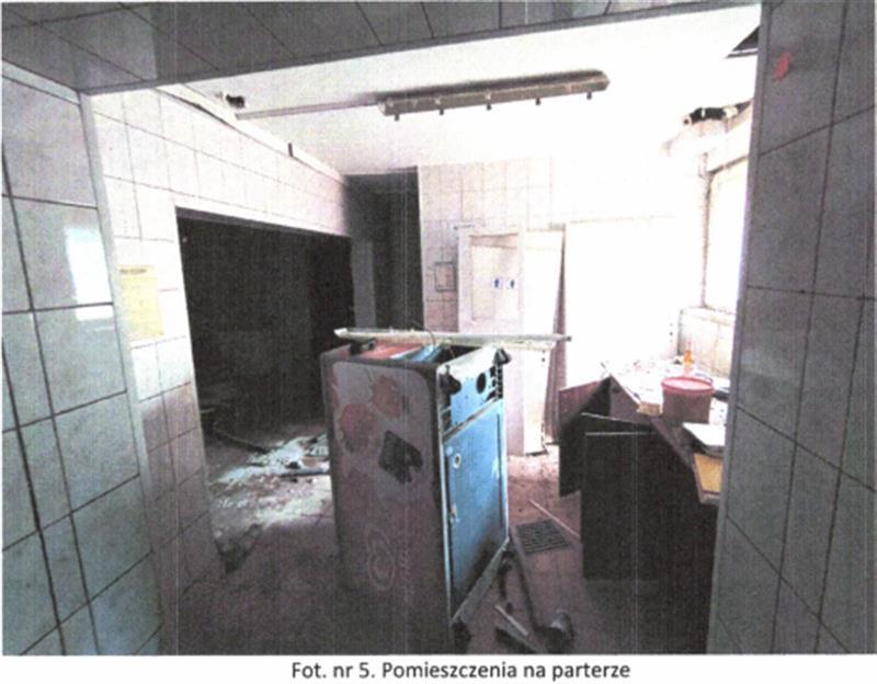 Układ funkcjonalny: na parterze znajduje się wiatrołap oraz pomieszczenia magazynowe zaplecza kuchennego, a także pomieszczenia sanitarne. Na I piętrze znajdują się dwa pomieszczenia usługowe oraz zaplecze sanitarne (wc i łazienka). Stan techniczny budynku dobry i standard wykończenia oceniona na niski. Obiekt nieużytkowany, wnętrza częściowo zdewastowane (pozrywane podwieszane sufity, częściowo usunięte instalacje elektryczne, uszkodzona instalacja CO-brak grzejników i armatury).