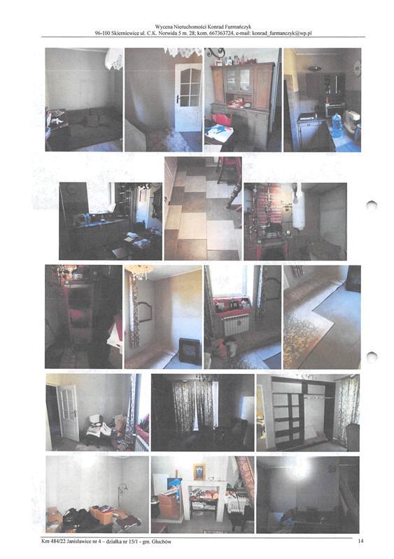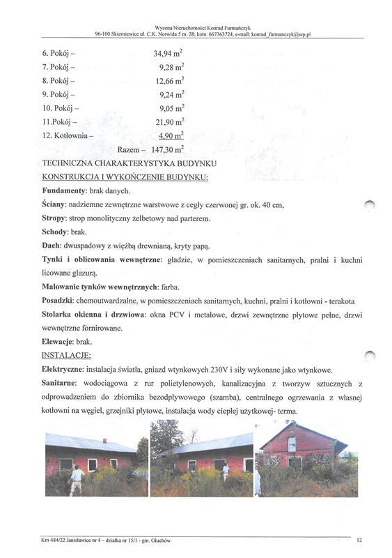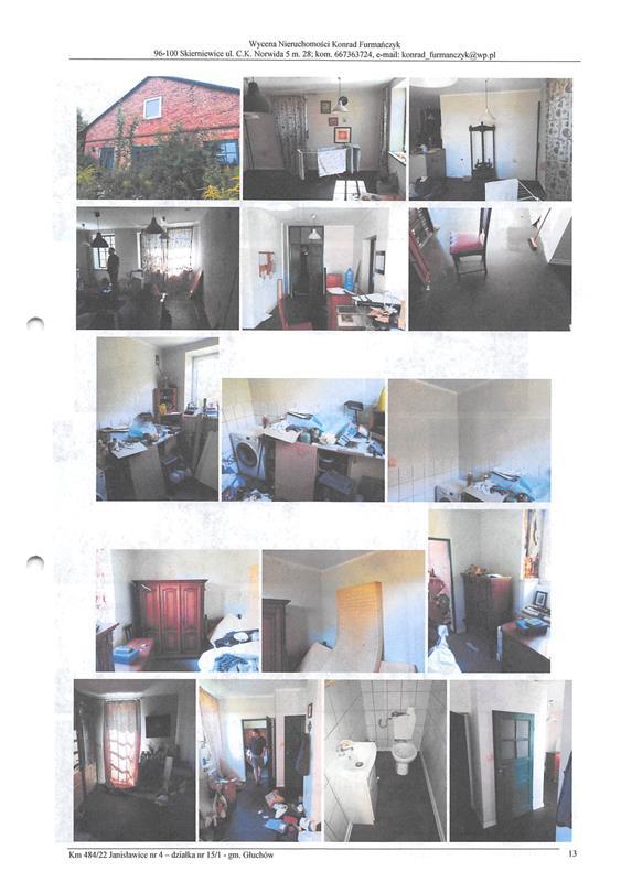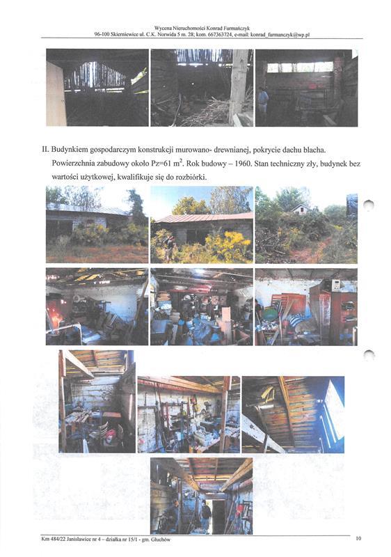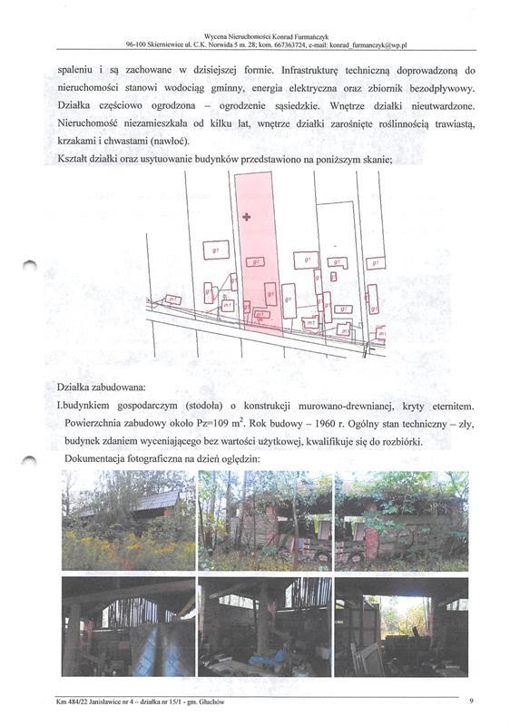 Nieruchomość gruntowa, zabudowana, położona pod adresem: 96-130 Głuchów, Janisławice 4, dla której Sąd Rejonowy w Rawie Mazowieckiej IV Wydział Ksiąg Wieczystych prowadzi księgę wieczystą o numerze LD1R/00037373/1. Nieruchomość składa się z działki nr 15/1, o łącznej powierzchni 4686 m2 (0,4686 ha), zabudowanej budynkiem mieszkalnym, budynkiem gospodarczym adaptowanym do funkcji mieszkalnej oraz dwoma budynkami gospodarczymi. Działka nr 15/1 o kształcie zbliżonym do prostokąta, o średnich wymiarach 34m x 142 m. Od strony południowej działka posiada bezpośredni dostęp do drogi gminnej o nawierzchni bitumicznej (droga gminna w pasie drogi powiatowej). Infrastruktura: przyłącze ee, wodociąg gminny, zbiornik bezodpływowy. Działka częściowo ogrodzona (ogrodzenie sąsiedzkie). Wnętrze działki nieutwardzone, teren zarośnięty trawą, krzakami i chwastami (nawłoć). Zgodnie z MPZP gminy Głuchów działka nr 15/1 jest położona na obszarze oznaczonym jako 1.1RM - tereny zabudowy zagrodowej w rodzinnych gospodarstwach rolnych, hodowlanych i ogrodniczych.