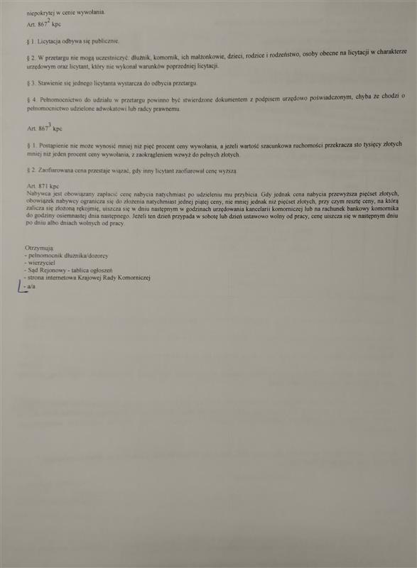 Nabywca jest obowiązany zapłacić cenę nabycia natychmiast po udzieleniu mu przybicia. Gdy jednak cena nabycia przewyższa pięćset złotych, obowiązek nabywcy ogranicza się do złożenia natychmiast jednej piątej ceny, nie mniej jednak niż pięćset złotych, przy czym resztę ceny, na którą zalicza się złożoną rękojmię, uiszcza się w dniu następnym w godzinach urzędowania kancelarii komorniczej lub na rachunek bankowy komornika do godziny osiemnastej dnia następnego. Jeżeli ten dzień przypada w sobotę lub dzień ustawowo wolny od pracy, cenę uiszcza się w następnym dniu po dniu albo dniach wolnych od pracy.