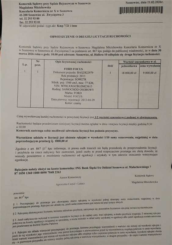 Komornik Sądowy przy Sądzie Rejonowym w Sosnowcu podaje do publicznej wiadomości, że w dniu 30-03-2026 o godz. 10:00 pod adresem: Hallera 10, 41-200 SOSNOWIEC, odbędzie się w trybie ustalonym w art. 867 ustawą z dnia 17 listopada 1964 r. Kodeks postępowania cywilnego (dalej: kpc) druga licytacja ruchomości składających się z: